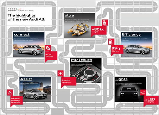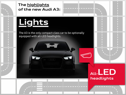 The new A3, which celebrates its premiere at the 2012 Geneva Motor Show, presents the combined technological competence of Audi in compact format. In its lightweight body, the architectures of its interior and user interfaces – the three-door car is once again setting standards in its class. Its engines impress with their efficiency and power, and the range of driver assistance systems and infotainment solutions is unparalleled in the premium compact class.