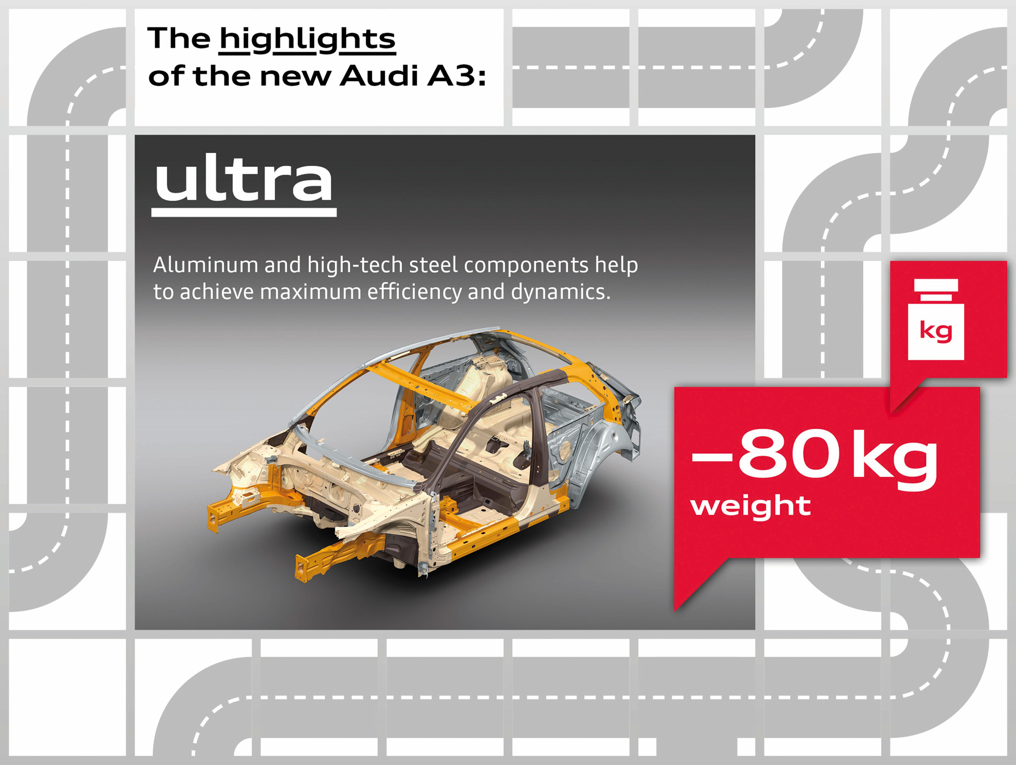 The lightweight body and downsized engines offer many secondary benefits for the overall vehicle; many components of the chassis, the exhaust system and interior have reduced weights. The A3 1.4 TFSI weighs just 1,175 kg – which is 80 kg less than the previous model and sets an impressive standard in the premium compact class.