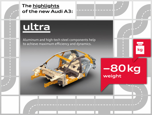 Ultra lightweight construction has long been a hallmark of the Audi brand. By no means is it limited to a specific material; instead, the motto is: “The right material in the right place for optimal function.†True to this maxim, engineers developed a multi-material body for the new A3.