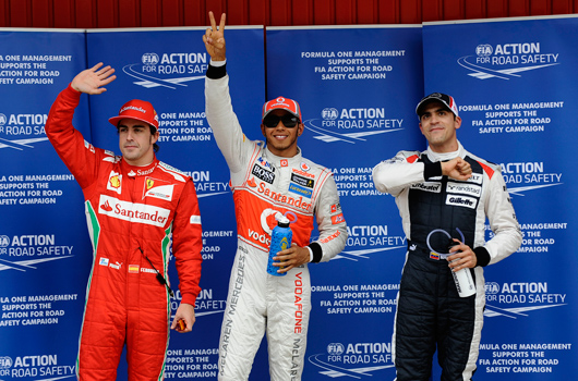 LH: Well, we’ve looked after our prime tyres, which is generally the better tyre for the race, or so it seems at the moment – the longer lasting tyre. Also the option tyres are all in good condition so… I think it’s going to be a massively tough race tomorrow. Of course, I’ve got these two great drivers next to me. I’m really happy to see this guy [Pastor Maldonado] up here and to see Williams up here and also Fernando. It’s really great to see my old team-mate up here as well and I’m going to have a great battle with these guys and I really hope we’re going to put on a great show for all the fans.