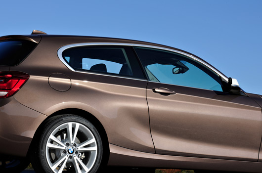 - New three-door BMW 1 Series with powerful, brand-typical proportions; Unique appearance thanks to dynamically stretched side line; Wide doors with frameless windows; Side window graphics flowing seamlessly into the B pillar and strongly retracted side window graphics; powerfully contoured side panels with particularly distinctive accentuation of the rear wheel arches; Side sill line extending to the front, underscoring the dynamically stretched character of the vehicle’s silhouette.