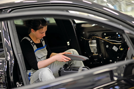 The custom features of the Black Dynamic were all produced by the apprentices: the sport seats upholstered in black-and-red Alcantara and leather, interior door trim with decorative red seams, the Deep Black Metallic exterior finish combined with flat anthracite film trim, the engine and gearbox management tuned to produce and transmit an extra 150 PS, the oversized exhaust system and the eight-piston brake system.
