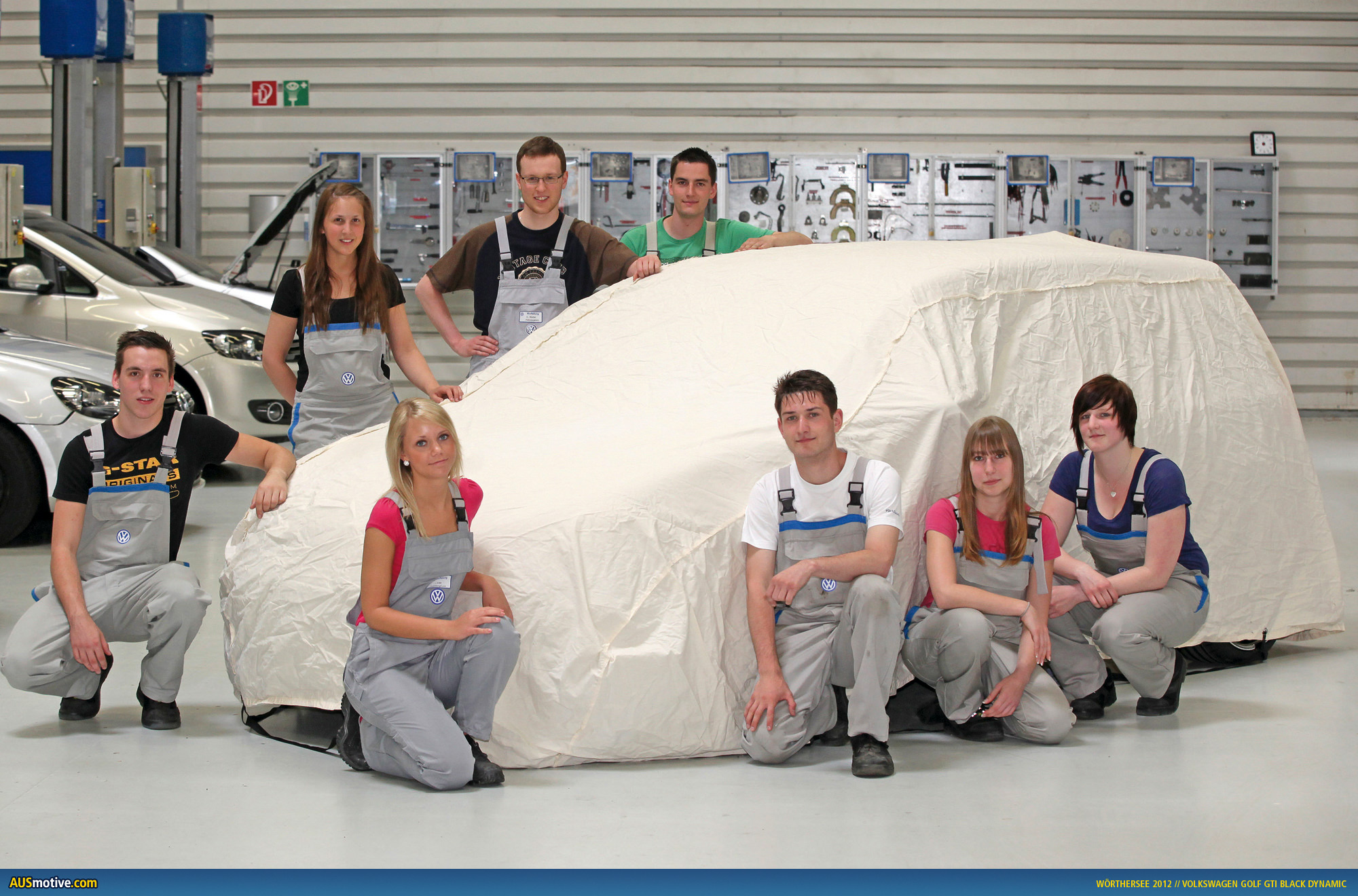 Names of apprentices on the GTI Black Dynamic team (by profession): Interior constructors: Charleen Pohle (19), Sarah Unverzagt (20); Paint technicians: Laura Krätz (18), Christian Wolter (23); Automotive mechatronics technicians: Lisa Batke (19), Roman Huck (24), Richard Neubert (18), Martin Schmidt (22); Process mechanic for plastic and rubber technology: Tim Köhler (19)