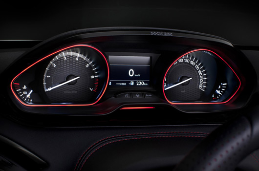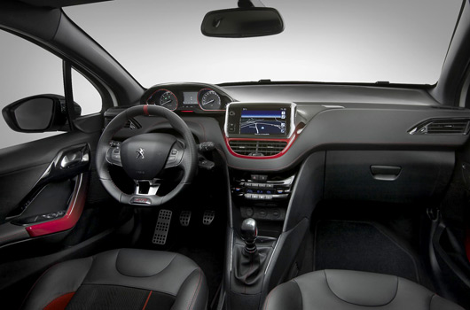 Attention to detail has also taken precedence in the design of the passenger compartment, to create a most pleasant environment. This applies even when stationary as it becomes evident at first glance when the door is opened, revealing the aluminium sill stamped with the Peugeot name. Dark colour schemes exist throughout the upper section and the 208 GTi offers a unique ambiance themed with red highlights.