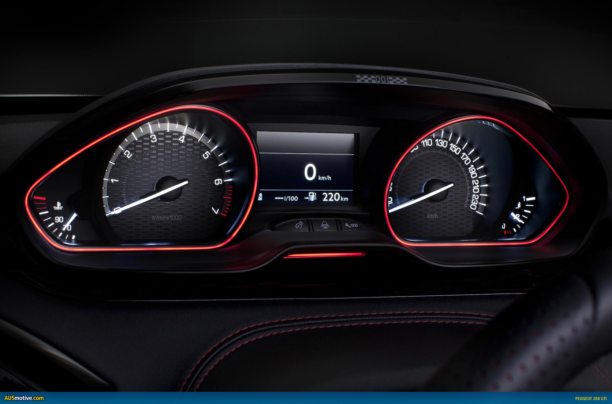 The driver is well supported in the cossetting seat structure, harnessed in black seat belts (with red edging) allowing an excellent driving position that is clear and comfortable. The feet naturally find the aluminium pedals and footrest, the heels in contact with the unique 208 GTi floor mats with black surround and again, overstitched in red. Intuitively, the hands rest on the small black full grain perforated leather steering wheel with red overstitching. The left hand easily and naturally finds the aluminium gear lever knob, with red side insert and the overstitched leather handbrake lever.