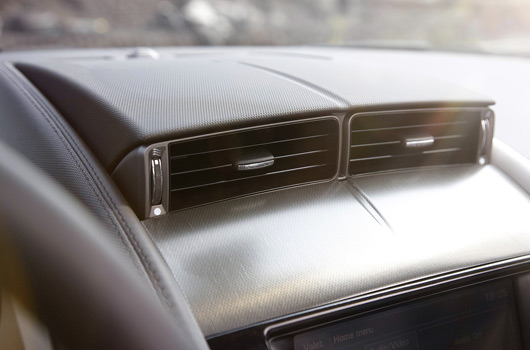 Taking inspiration from cockpits of fighter airplanes, the controls are ergonomically grouped by function. Further aeronautical inspiration can be found in the joystick-shaped SportShift selector controlling the eight-speed transmission. The air vents on top of the dashboard will only deploy when instructed to by either the driver or complex control algorithms, staying tucked discreetly out of sight in other circumstances.
