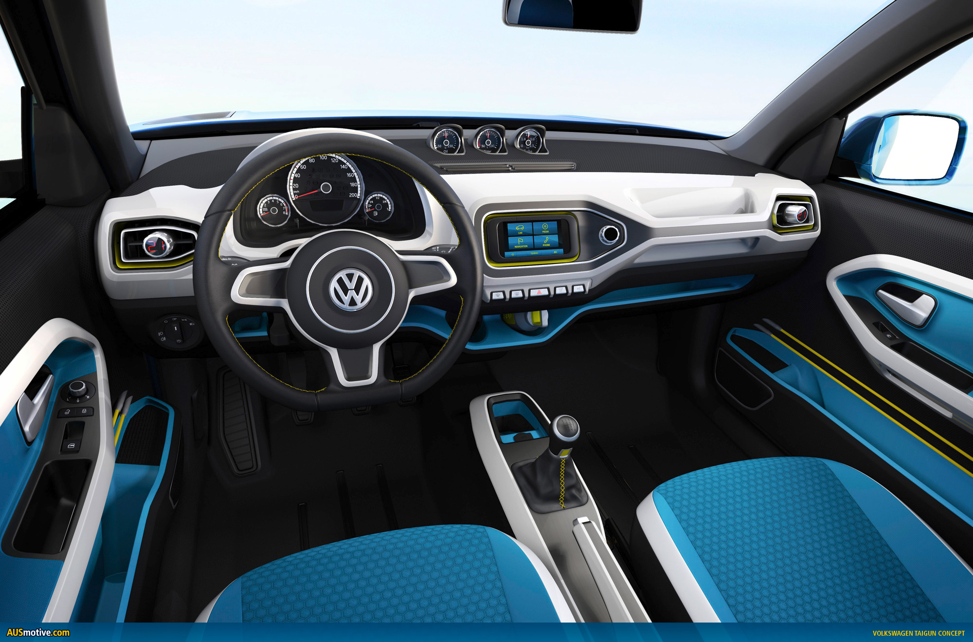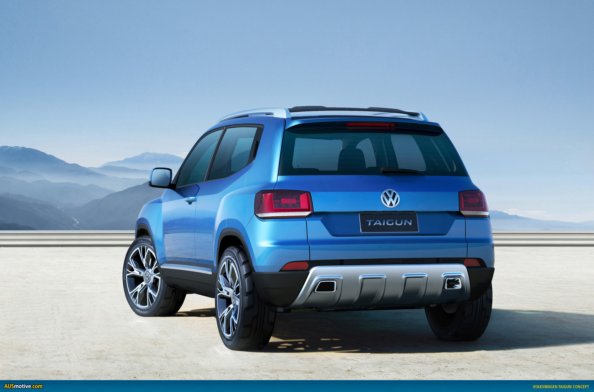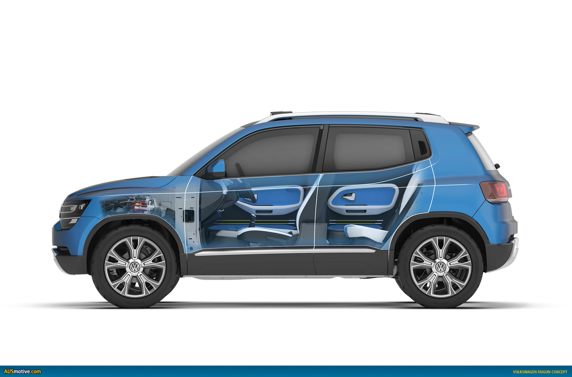 The styling of the concept car, which is painted in “Seaside Blue”, lives up to its sophisticated technological concept. The Taigun has an exterior look that is independent, confident and very logical and clean. In a side view, the flared wings catch the eye; their powerful form is smoothly integrated into the side section and extends into the doors.