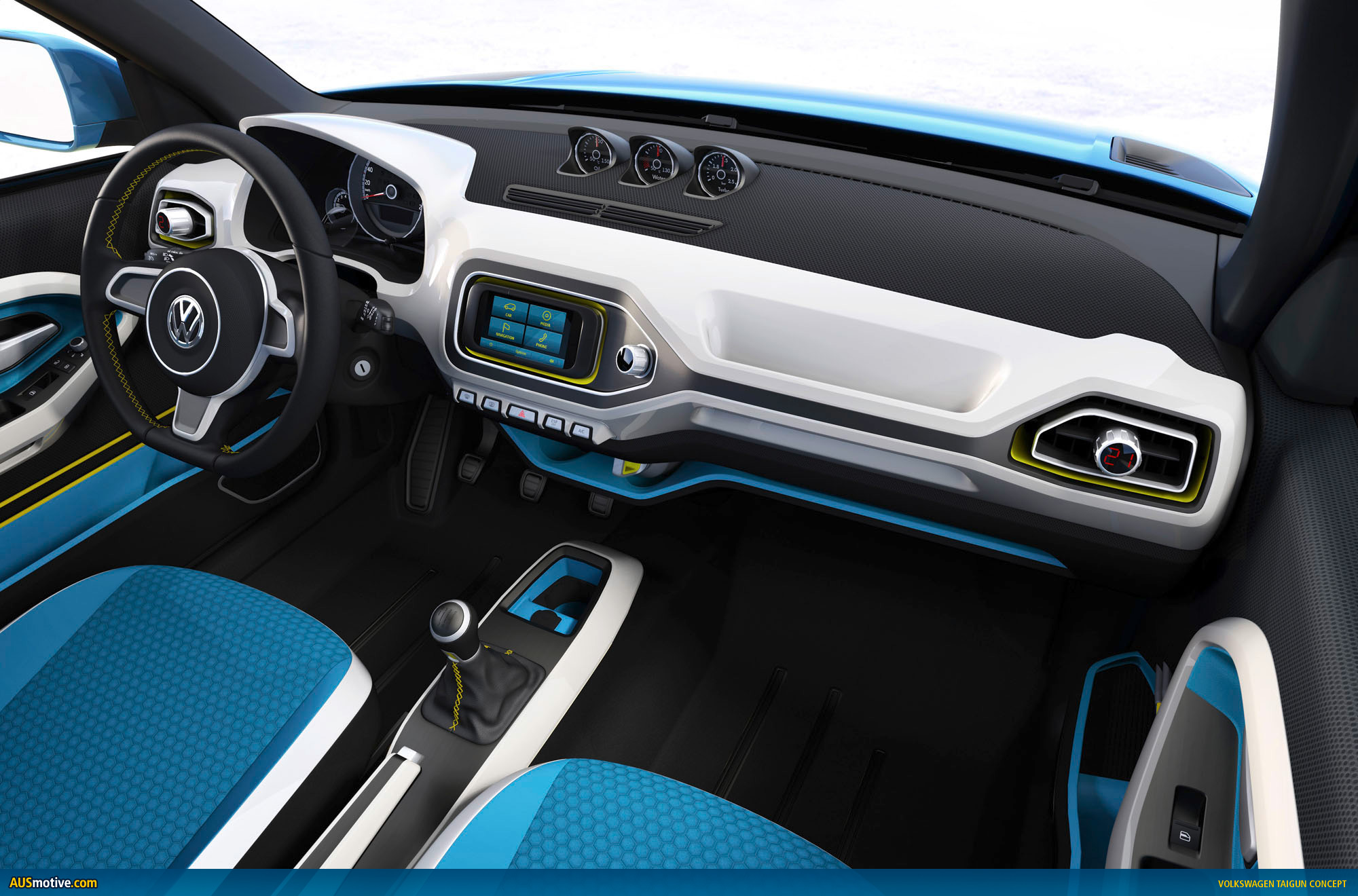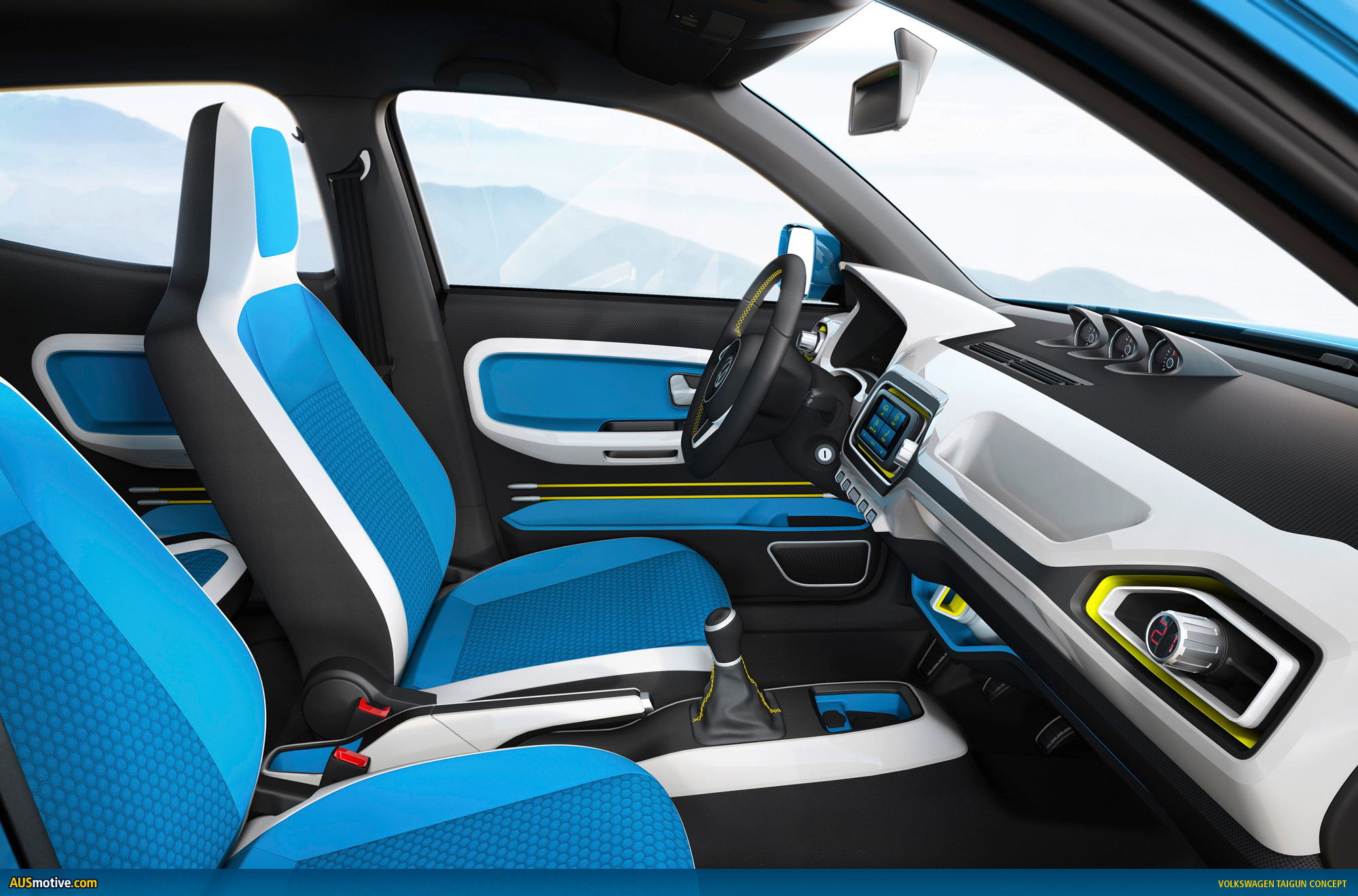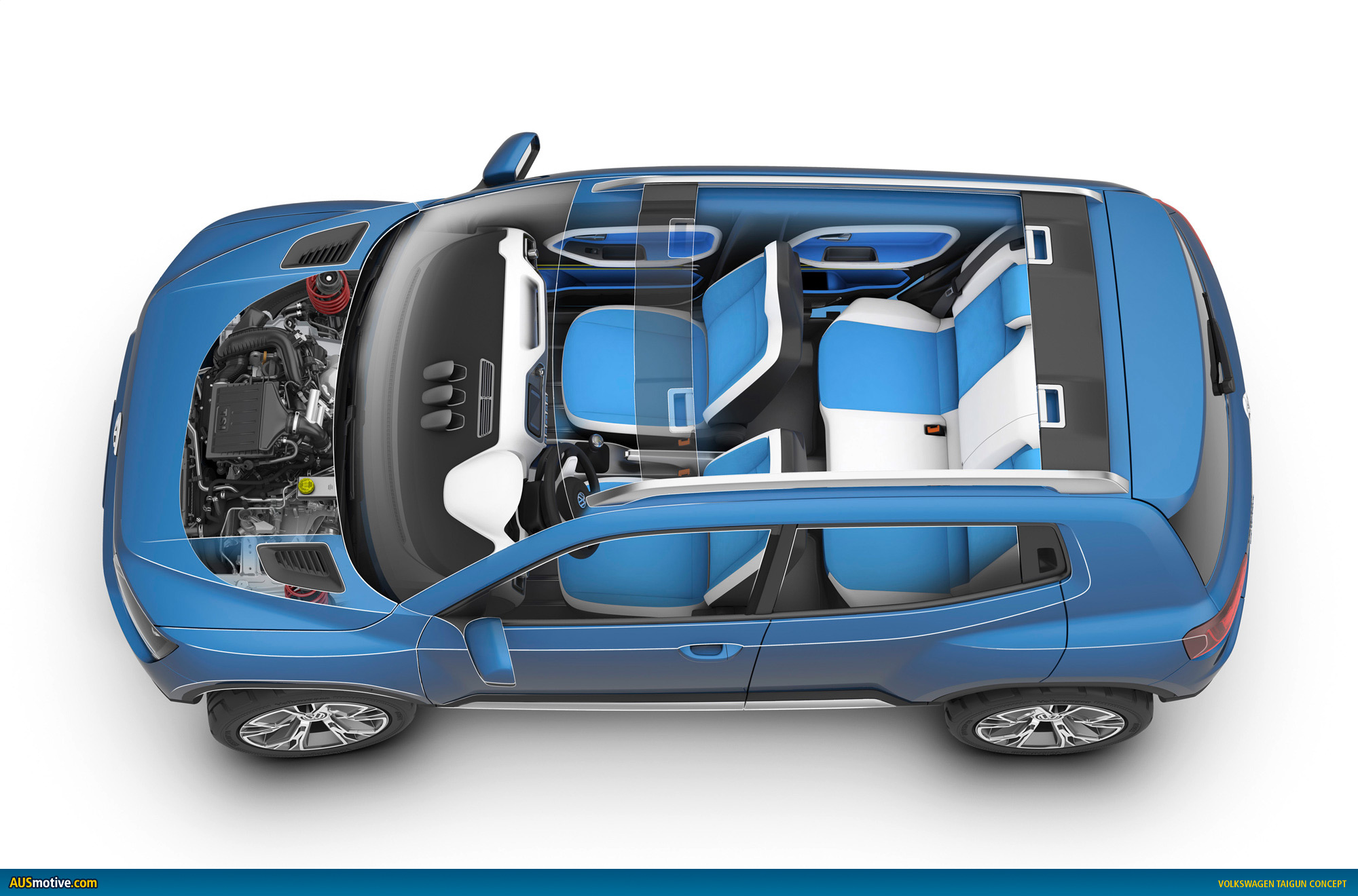 The styling of the concept car, which is painted in “Seaside Blue”, lives up to its sophisticated technological concept. The Taigun has an exterior look that is independent, confident and very logical and clean. In a side view, the flared wings catch the eye; their powerful form is smoothly integrated into the side section and extends into the doors.