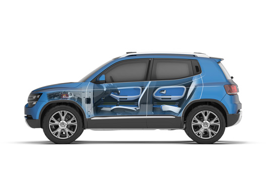 The four-seat concept car is powered by a new 1.0-litre TSI engine with 81 kW / 110 PS. The Taigun engine extends the range of the three-cylinder petrol engines by adding direct fuel injection plus turbocharging technology, which opens a new chapter in downsizing strategy at Volkswagen. The engine delivers a high torque of 175 Nm at a low 1,500/min. Dr. Ulrich Hackenberg, Member of the Board of Management of the Volkswagen Brand for Technical Development, comments: “The torque-strong three-cylinder is an ideal engine for such a compact SUV; it is a companion for driving through the urban environment that is as efficient as it is dynamic.” The lightweight concept car, weighing 985 kg, has a top speed of 186 km/h and accelerates to 100 km/h in 9.2 seconds; its combined fuel consumption is about four and one-half litres of fuel per 100 km.