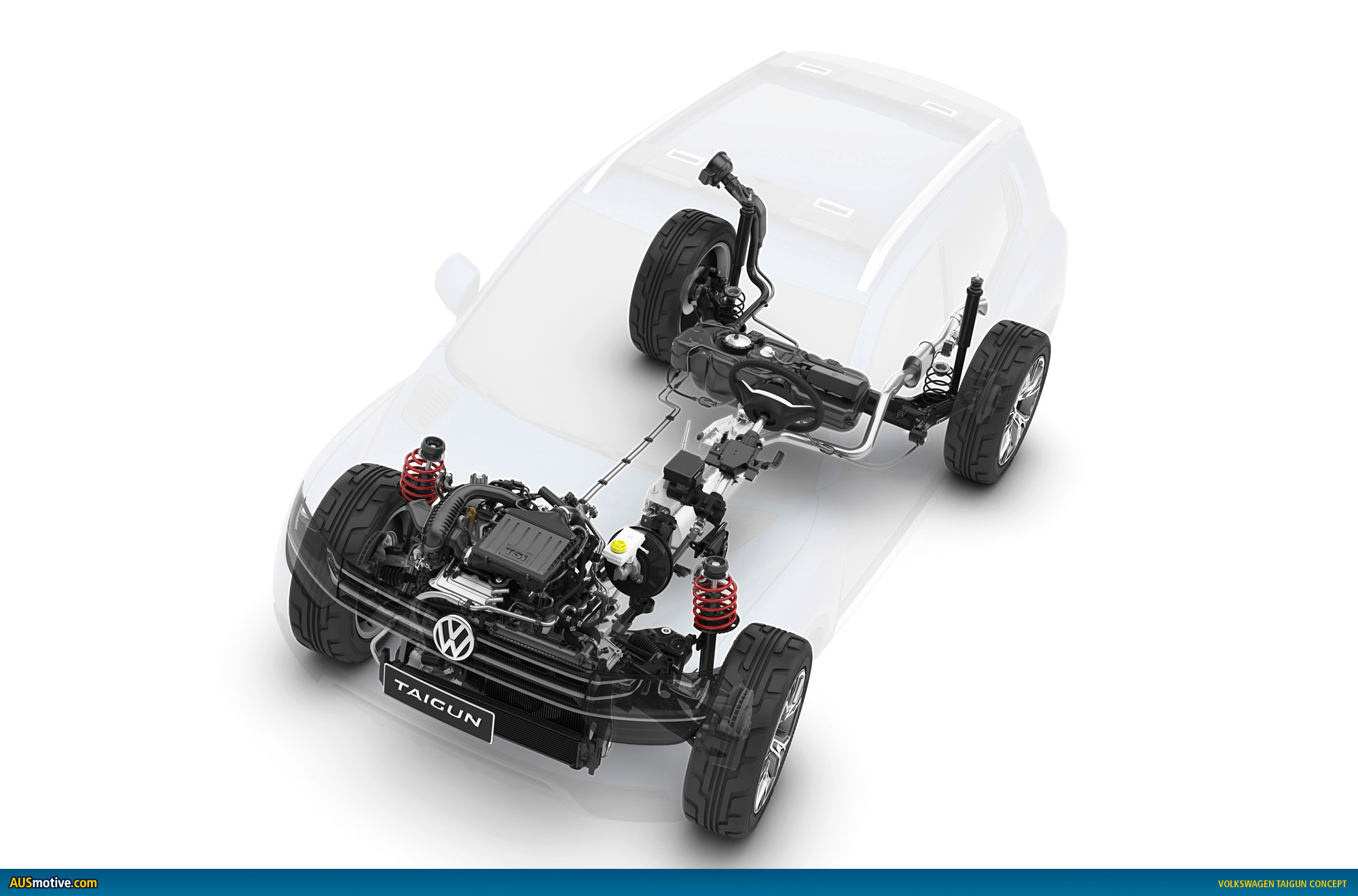 Like the Volkswagen Tiguan and Touareg SUVs, the Taigun also exhibits lines that are dominated by horizontal design elements in front. A metal underbody protection panel was designed into the bumper. This was also done at the rear bumper. Overall, horizontal lines also define the styling at the rear section. The tailgate of the concept is designed in two-part construction. The upper section that extends down to the lower edge of the rear lights swings upward, while the lower section (1/3) extending to the underbody protection swings downwards towards the road.