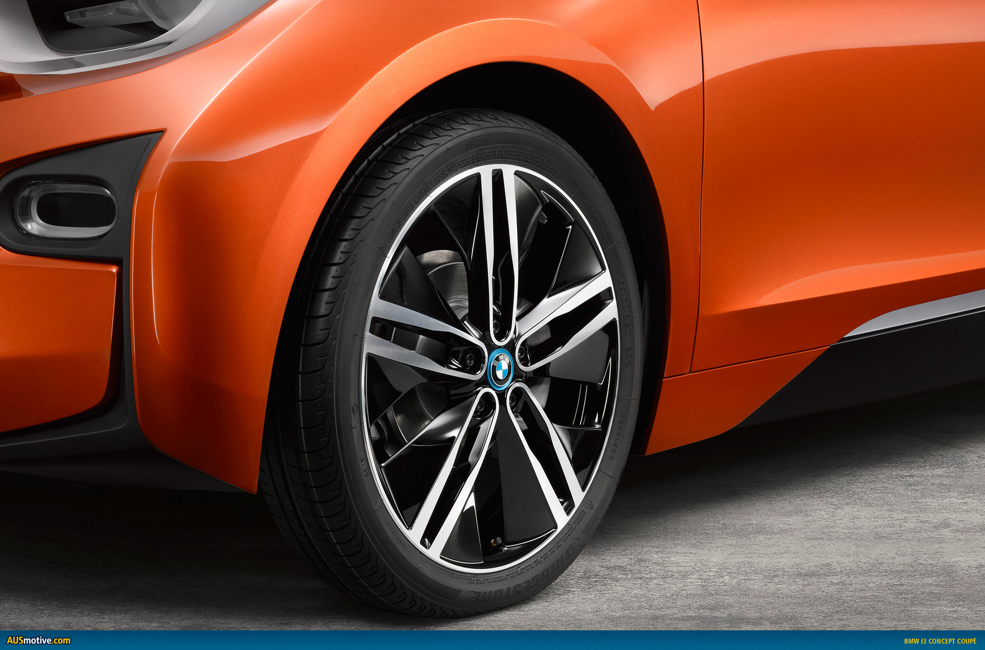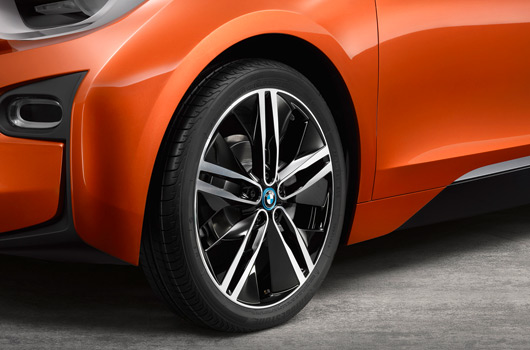 The highly distinctive and dynamic view of the BMW i3 Concept Coupe in profile is completed by the gently rising swage line on a level with the door openers, as well as a striking character line that produces an intriguing interplay between light and shade just above the side sills. The exterior mirrors also sport a design that’s specific to this model, with black mirror bases and caps in Solar Orange metallic that pick up on the body’s overall colour scheme. 20-inch light-alloy wheels in double-spoke design further intensify the car’s sporting aura. As is customary for BMW i models, they are shod with comparatively narrow, reduced rolling-resistance tyres measuring 155/60 R20 at the front and 175/55 R20 at the rear.