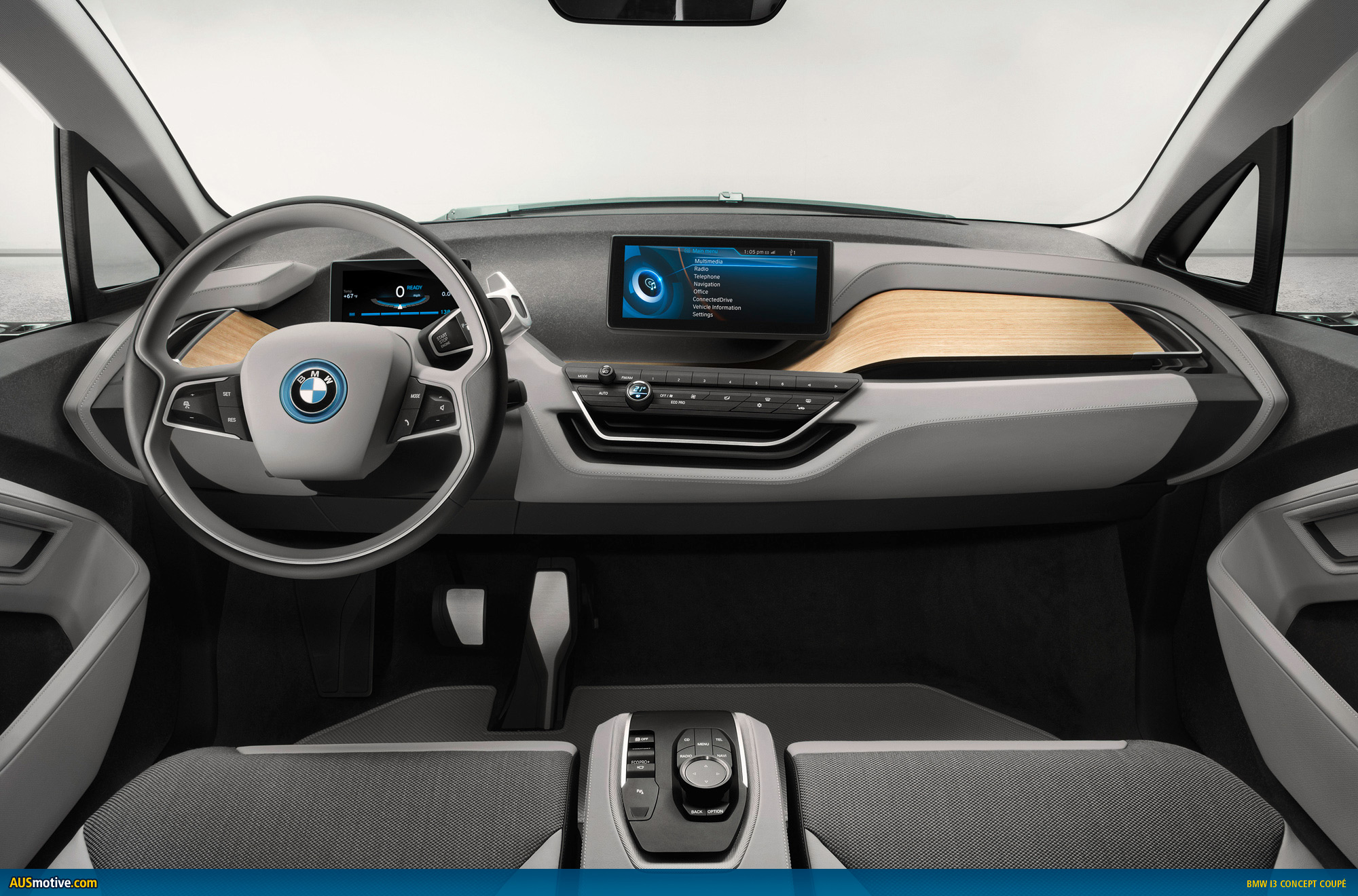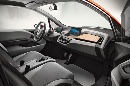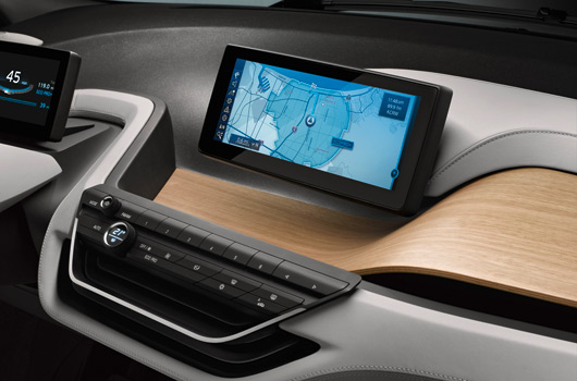 Information is visualised in the form of three-dimensional, high-resolution graphics depicted in the reduced style typical of the BMW i brand. The task of the instrument cluster is assumed by a 6.5 inch (16.5 centimetre) screen positioned on the steering column, where all driving-related information appears in digital form. The second display in the centre of the dashboard is positioned at exactly the same height for perfect legibility. With a screen diagonal of 8.8 inches (22.4 centimetres), it enables detailed graphics to be reproduced, just like the central information display in BMW production cars. This screen is used, for instance, to display the functions of the navigation system including the BMW i ConnectedDrive services. The information provided by the functions familiar from BMW ConnectedDrive is likewise shown here. This central information display also serves to keep the driver and front passenger fully informed of the vehicle’s status and the drive system’s operating mode.