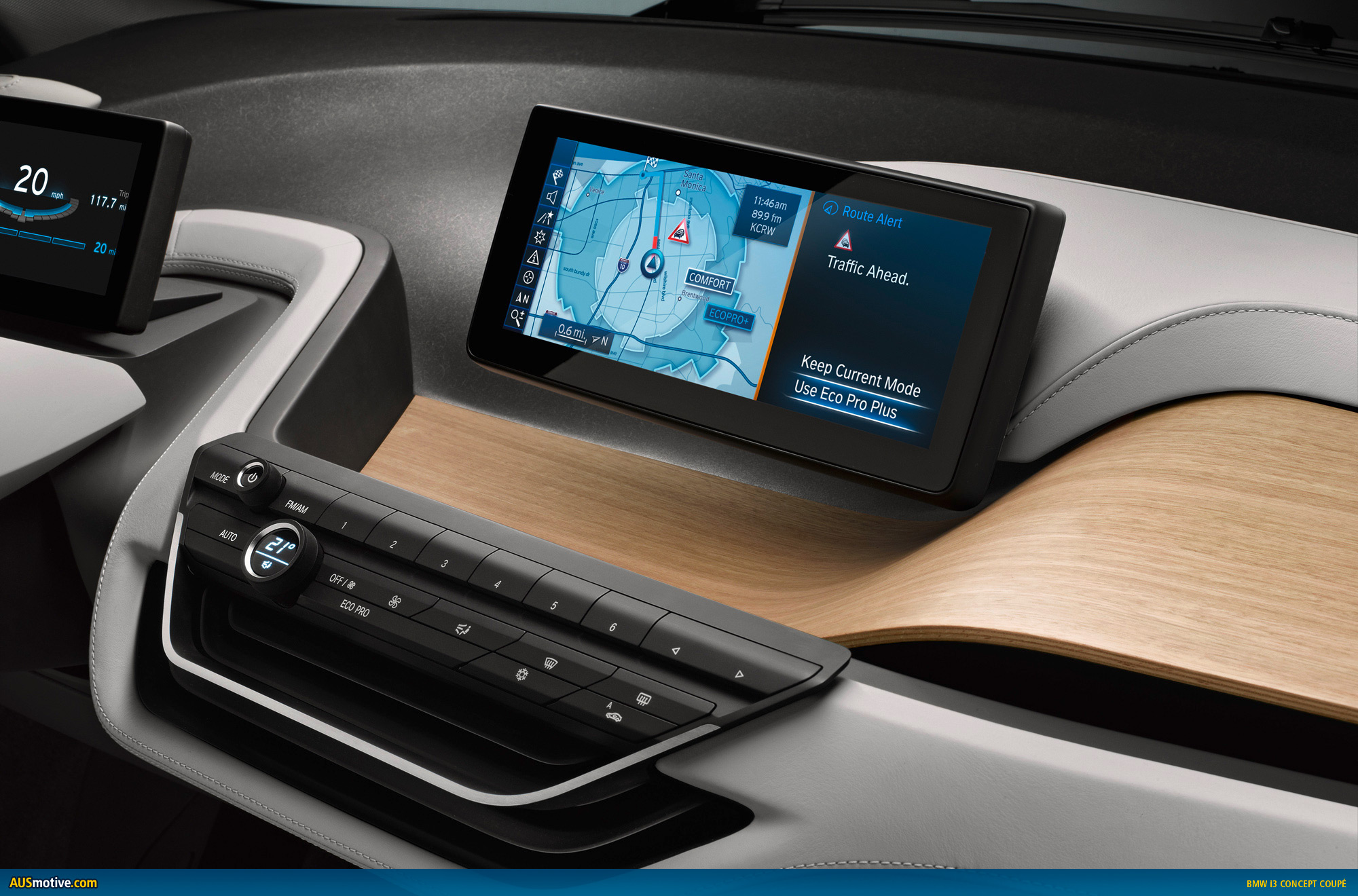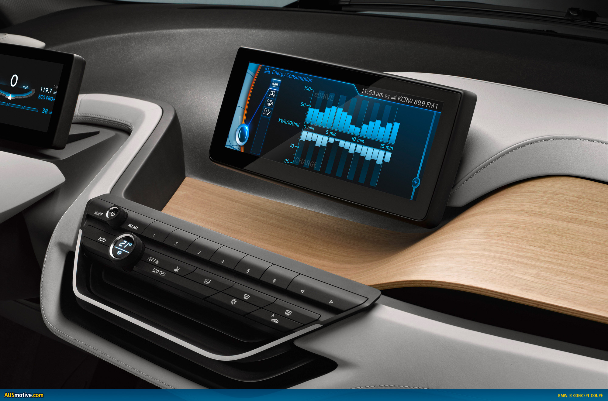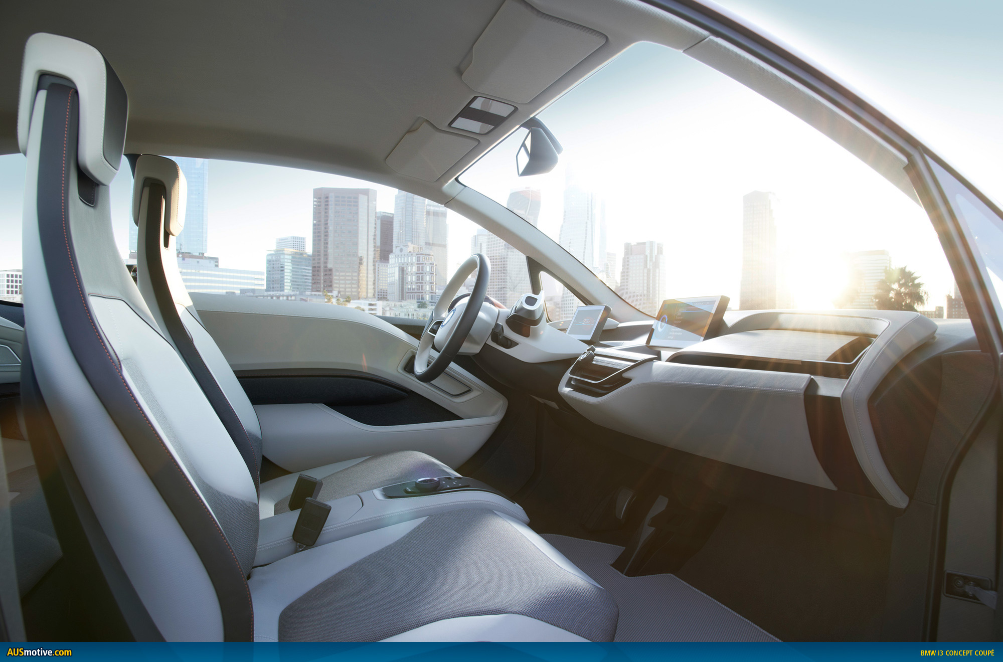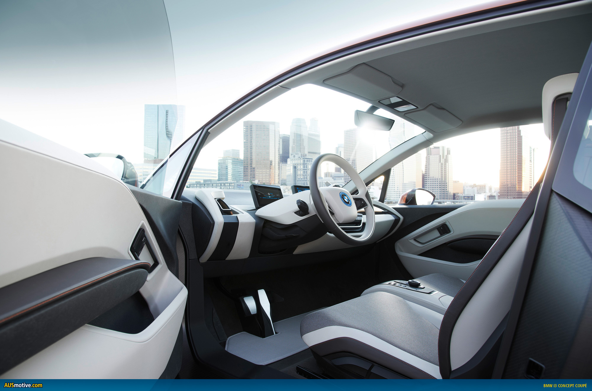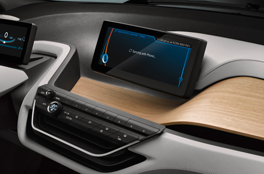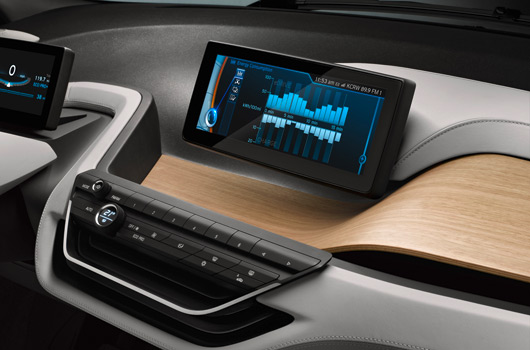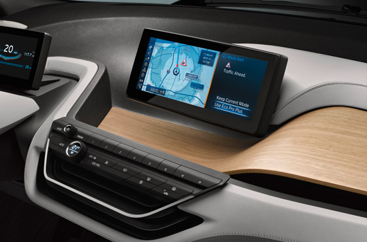 The BMW i3 Concept Coupe comes with two top-class displays, which provide the interfaces for the exchange of information between vehicle and driver and for operating the infotainment and communications functions. Information that can help to make driving a more comfortable, efficient and safe experience is flashed up in the displays. The navigation system, meanwhile, is networked with the outside world via BMW i ConnectedDrive.
