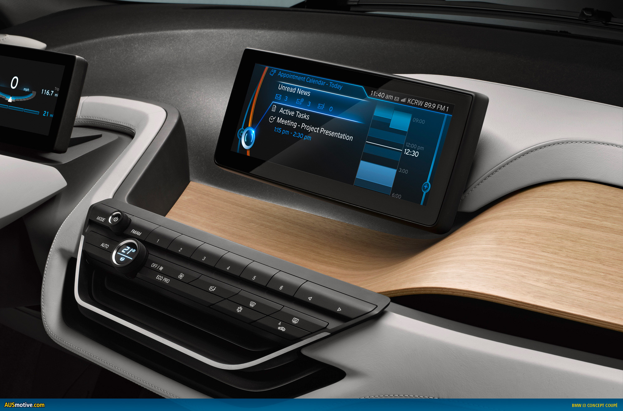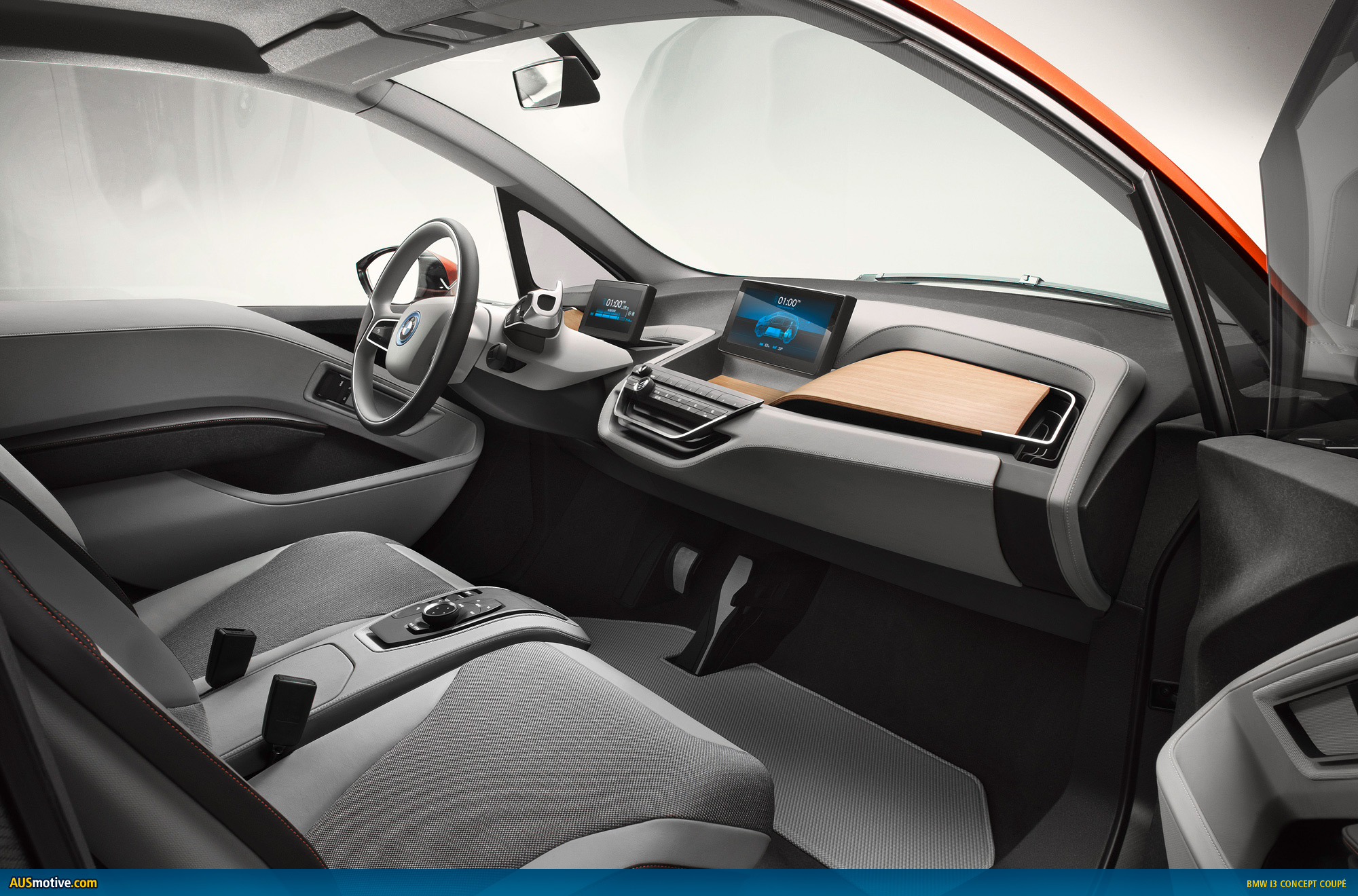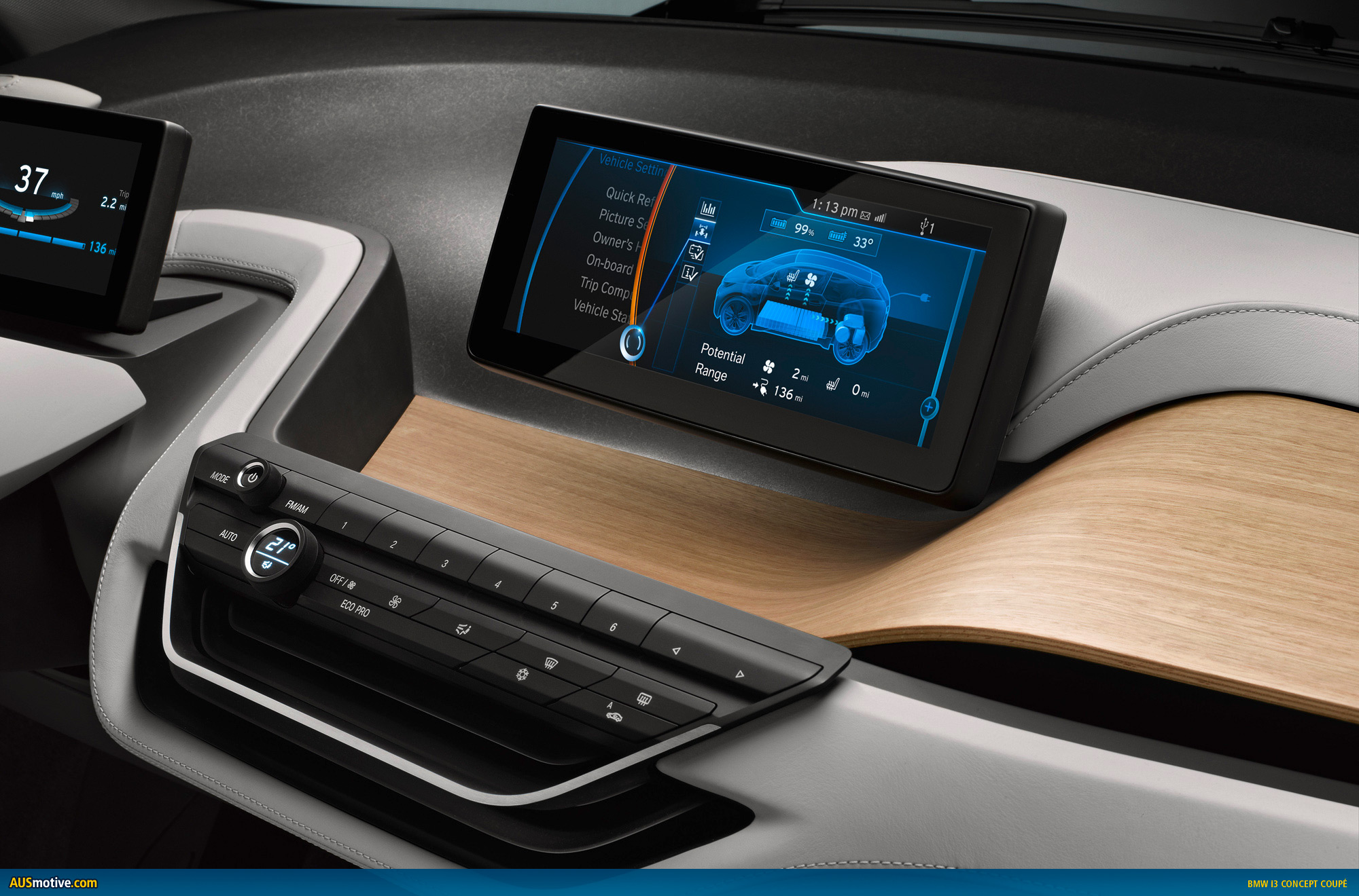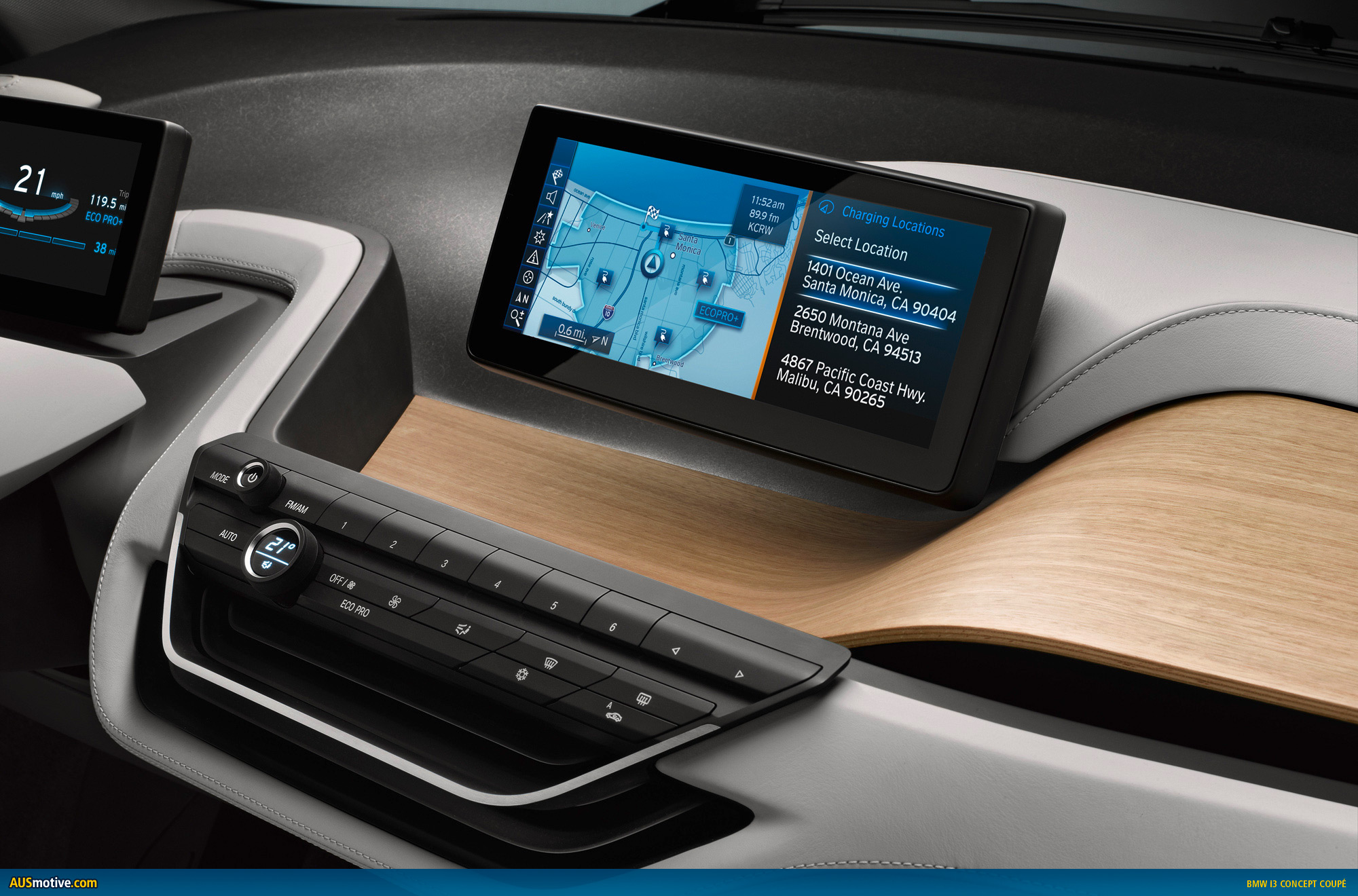 The BMW i3 Concept Coupe comes with two top-class displays, which provide the interfaces for the exchange of information between vehicle and driver and for operating the infotainment and communications functions. Information that can help to make driving a more comfortable, efficient and safe experience is flashed up in the displays. The navigation system, meanwhile, is networked with the outside world via BMW i ConnectedDrive.
