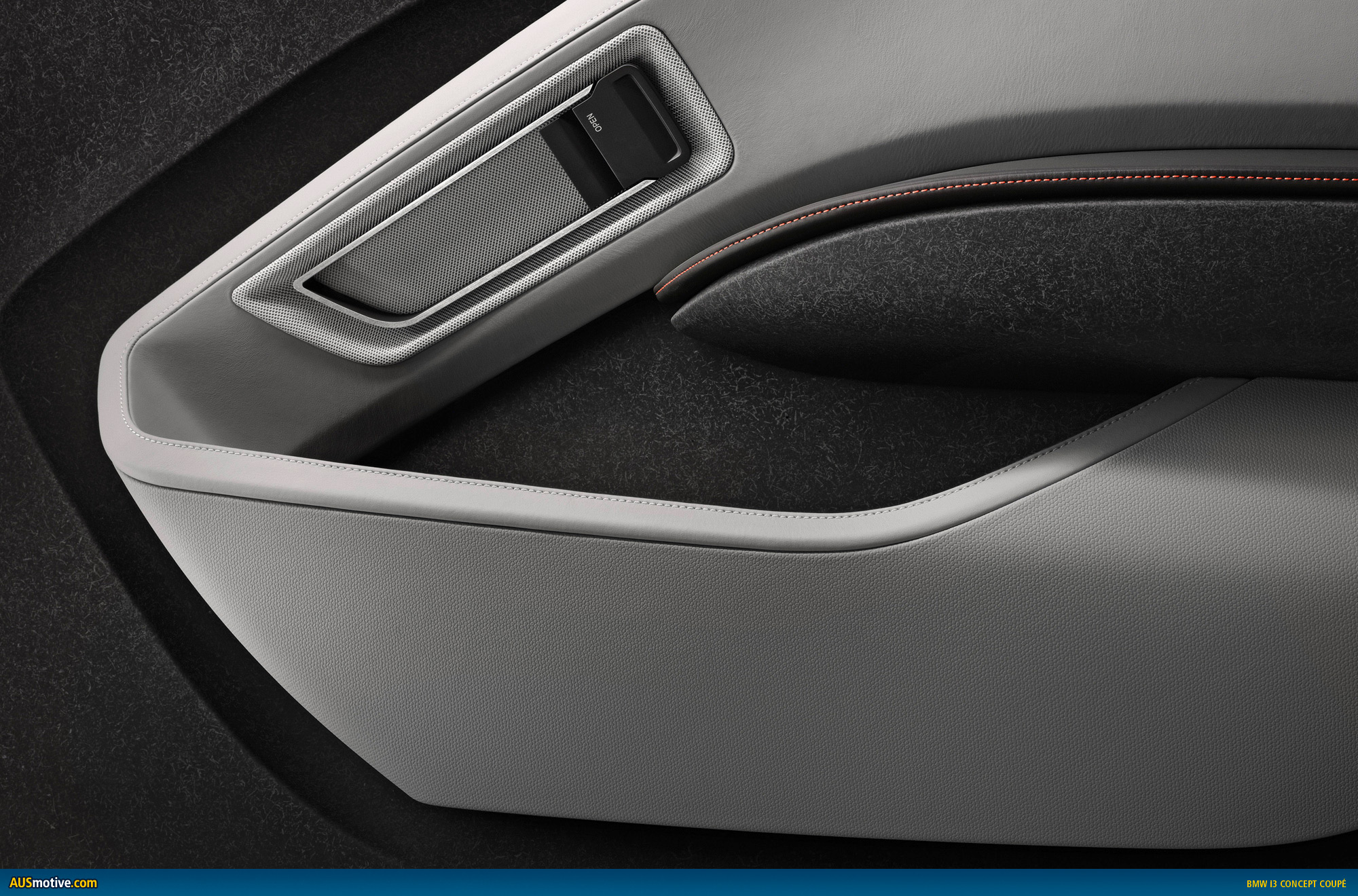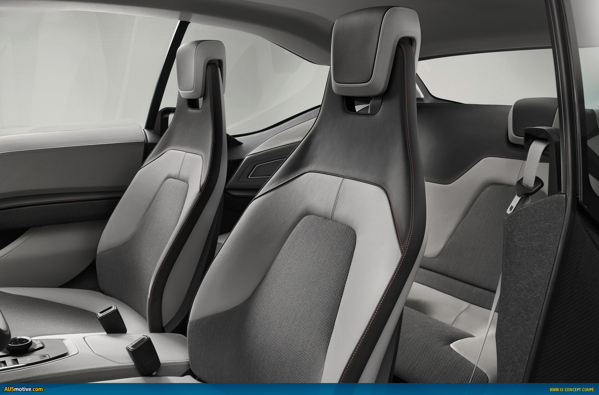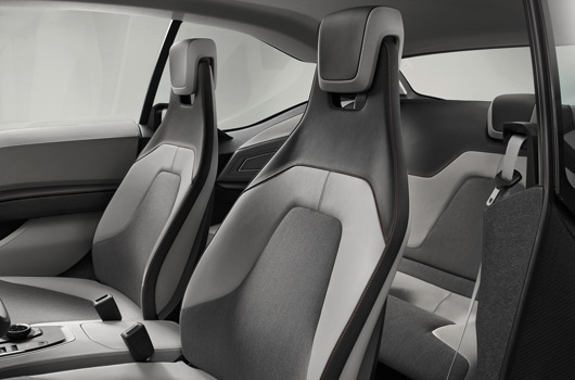 There are two individual seats in the rear of the BMW i3 Concept Coupe where passengers are able to savour a whole new form of motoring comfort in a lounge-style ambience. The seat backrests both curve outwards prominently to form a seamless connection with the rear panelling. Whereas the seating position engenders a feeling of security, the windows – which are exceptionally large for the rear of a coupe – make passengers there feel more part of the driving experience. After tilting the front seat backrests forwards, getting in and out of the rear is facilitated by leather-trimmed grab handles that double as belt feeders for the driver and front passenger.