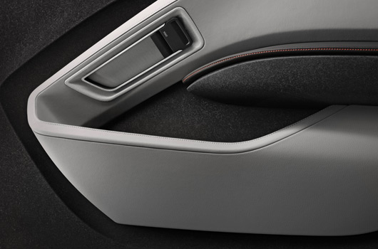 The manually adjustable seats with integrated head restraints that were specially designed for the BMW i3 Concept Coupe are upholstered in a blend of warm-toned textured wool yarn and a cool-looking monofilament material. The elegant, sporty colour scheme’s light grey tones also reflect the sustainable character of the natural materials. The door support panels made from anthracite-coloured kenaf fibre are perfectly in keeping with this, and also blend harmoniously with the doors’ leather trim panels. The leather adorning the interior of the BMW i3 Concept Coupe is treated using natural products exclusively, with an extract from the leaves of the olive tree serving as the tanning agent.