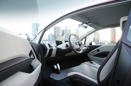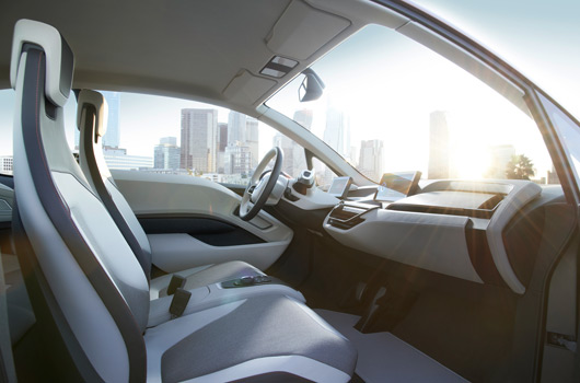 At the cockpit’s centre, the bottom of the dashboard terminates in a flat control panel that is angled slightly towards the driver and is used to operate the climate control and audio functions as well as housing the favourite buttons for the iDrive system. The iDrive Controller and direct menu control buttons are located on the centre console between the driver and front passenger on a level with the seat cushions. The BMW i3 Concept Coupe has also kept the area between the dashboard and seat cushions completely clear across the cockpit’s entire width. Its particular drive concept, furthermore, dispenses with the need for the transmission tunnel normally found on conventional vehicles, resulting in a completely open space connecting the left and right footwells. Not only does this create an impression of roominess, it can be of practical benefit, too, as it allows the driver to easily swap to the front passenger seat and get out on that side – a real boon, for example, when using city-centre parking spots so tight that the driver’s door cannot be opened.