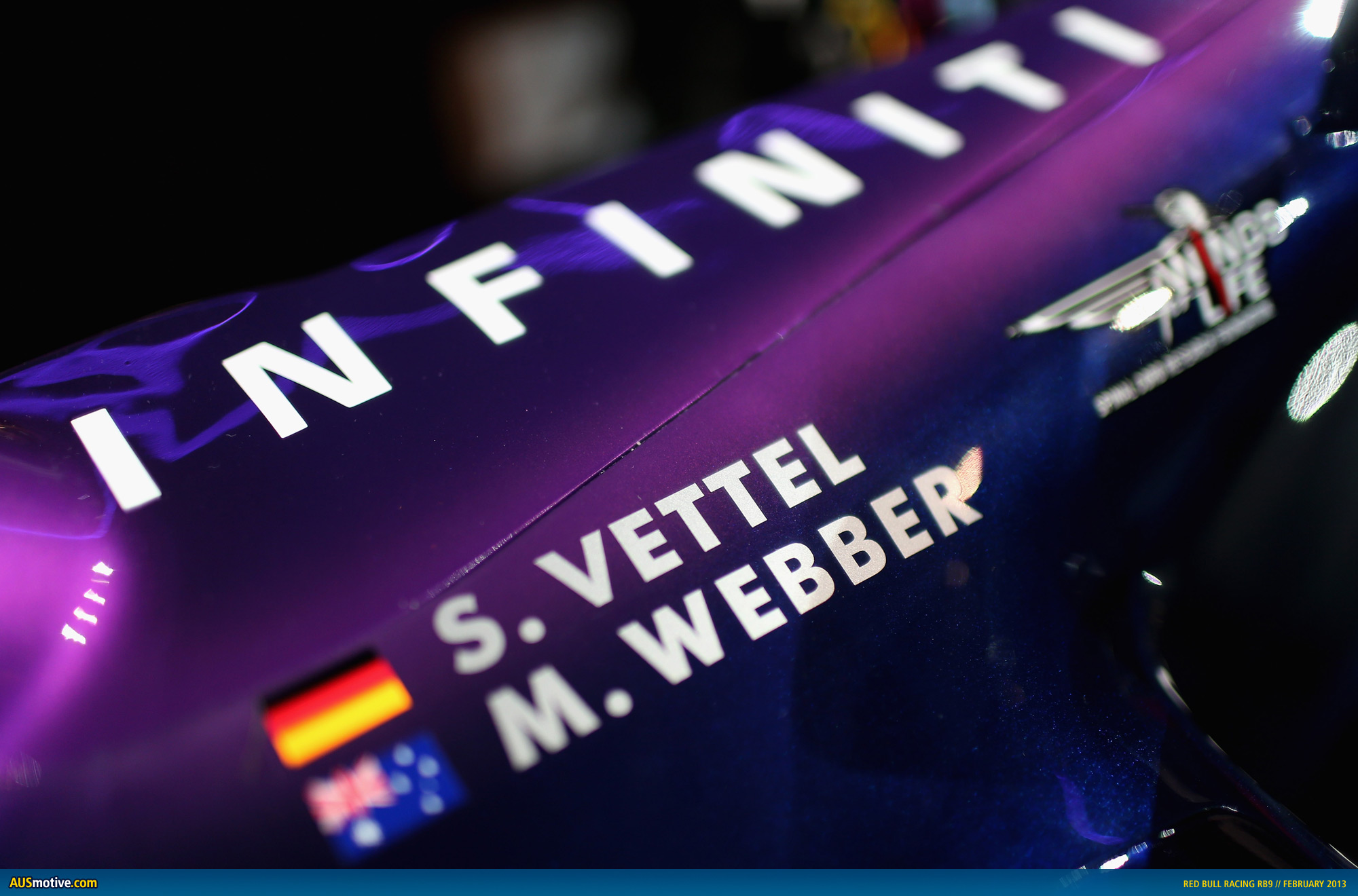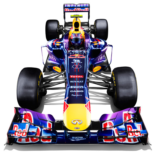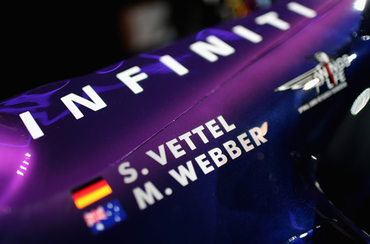 Triple World Formula One Champion Sebastian Vettel and nine-time grand prix winner Mark Webber were on hand at the team’s UK base at Milton Keynes to give the world’s media its first glimpse of the new car and livery, which integrates Infiniti’s purple-hued branding with the team’s existing racing colours.