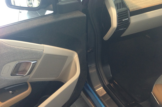 Inside the i3 you’re greeted at first by a light and pleasant cabin. There’s an immediate premium feel and the timber paneling actually works quite well. On closer inspection, though, there’s quite a lot of sub-premium plastic and felted paneling used (mostly around the doors and behind the dash). From a purely visual point of view these materials don’t stand out, but looking at the scuff marks on the driver’s door sill it doesn’t look as though they will wear well over long-term ownership.