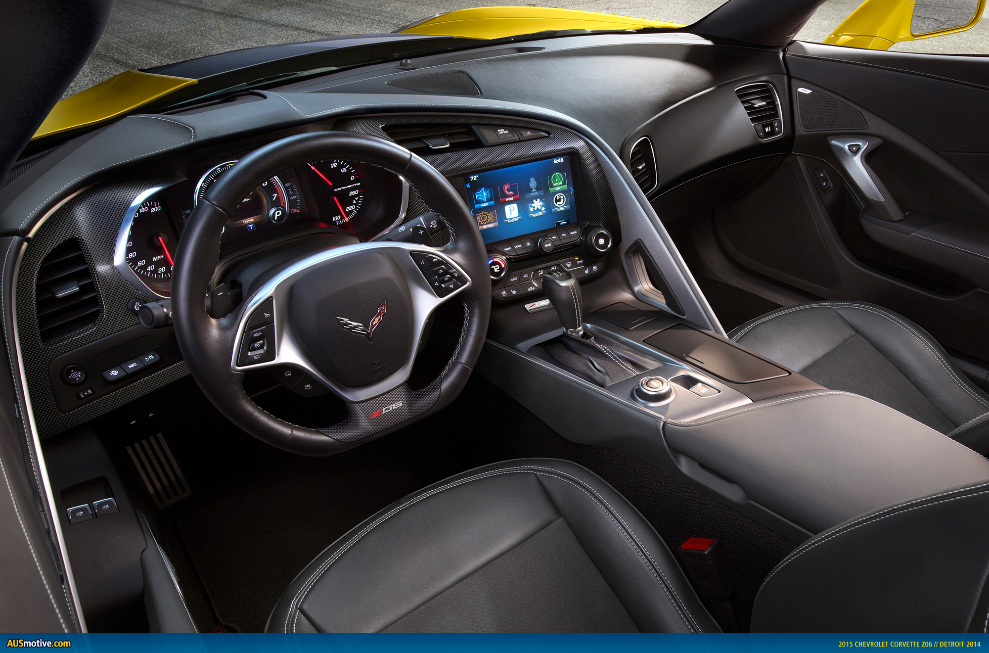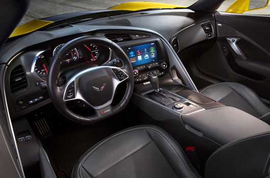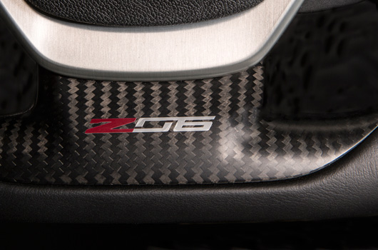 Inside, the Corvette Z06 is distinguished from the Corvette Stingray by unique color schemes that emphasize the driver-focused cockpit, and a unique, flat-bottomed steering wheel.