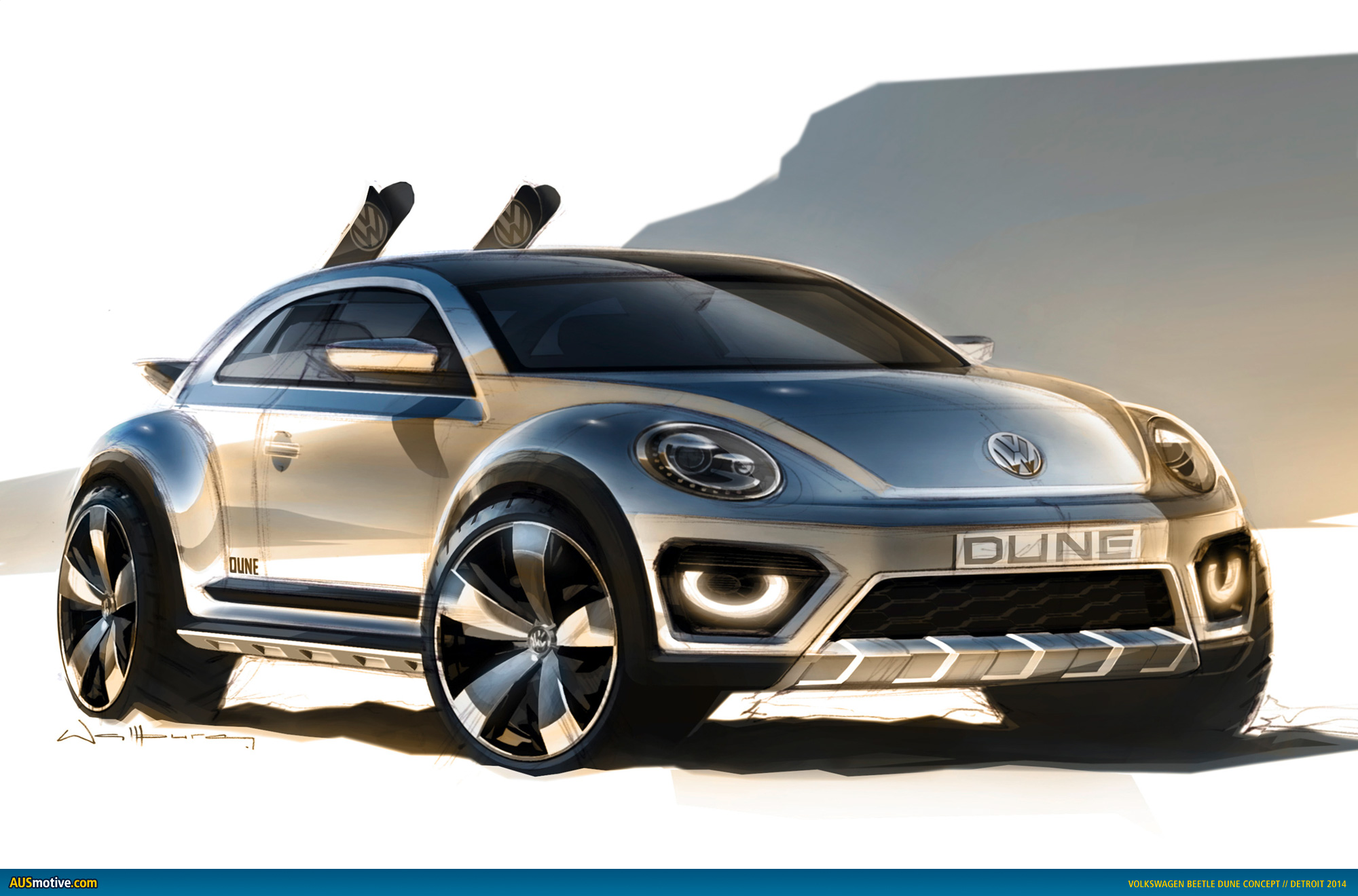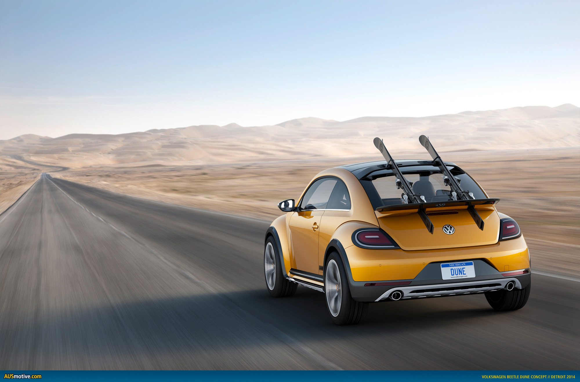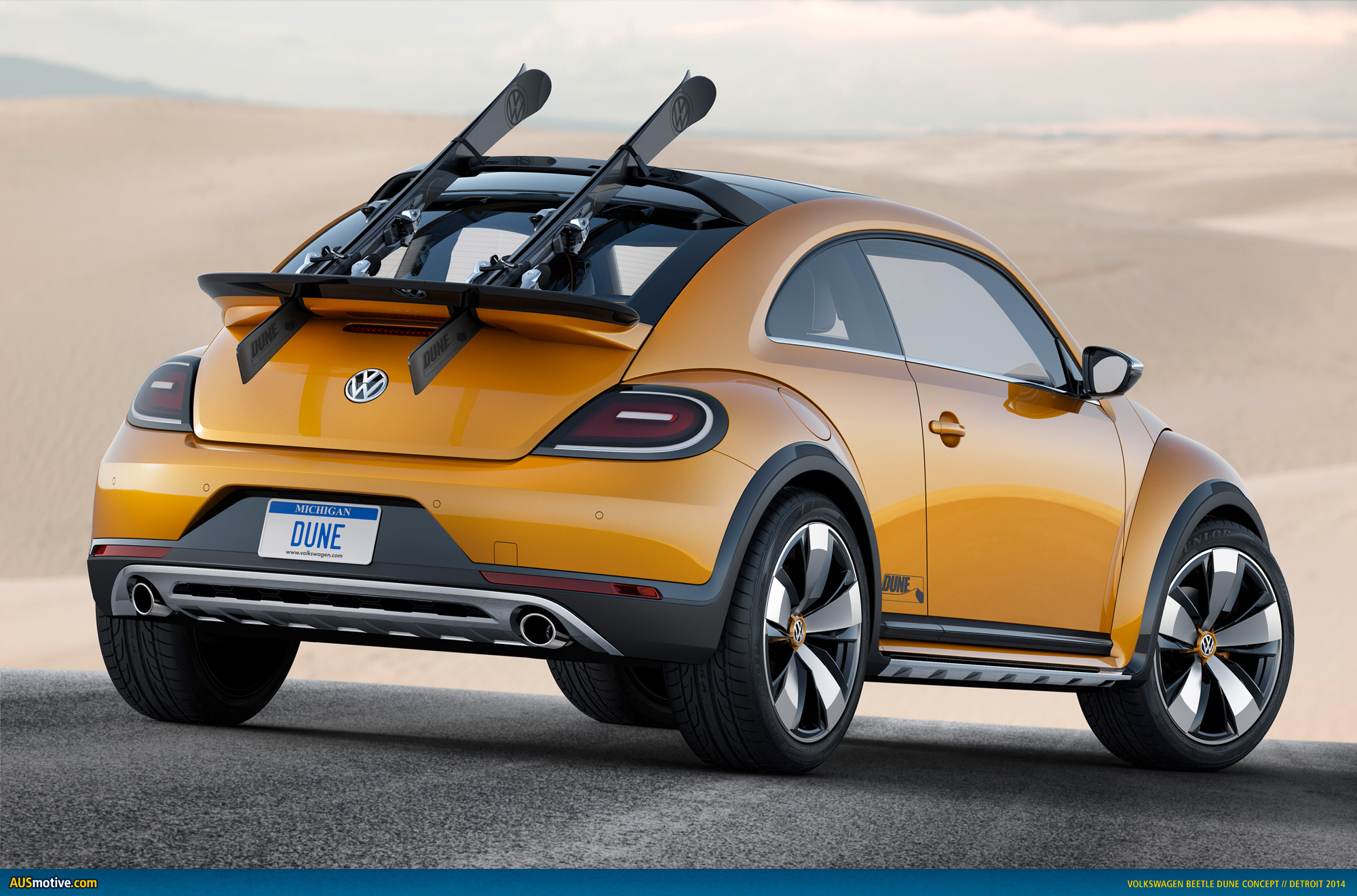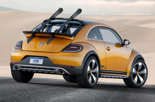 Concept car with near-production design. The Beetle Dune is a concept car. At least for now. But everything about this car is feasible ̶ practically a production vehicle. The car points the way to next summer in the midst of a Michigan winter. And until the sun thaws this state again, the Dune will show how even the cold season of the year has its fascinating side: winter sports. That is why designers buckled a pair of skis to the back of this Beetle, whose body was raised 50 mm. Like the legendary Beetle of days past and the air-cooled sports car from Porsche. Dune – its name, its raised body, large 19-inch tires and all-terrain look all call out for this, just like the VW buggies conquered beaches and dunes in times past. And so, in the summer, skis for sandboarding are attached to the trunk lid – securely latched by clever mechanisms on the rear body and roof spoiler – surfing on dunes such as those at the Sand Master Park in Florence, Oregon. New sandboarding hot spots are emerging wherever there are dunes in the world. In the Beetle Dune, Volkswagen is revisiting an idea that was born in January 2000 with the New Beetle Dune presented in Los Angeles. While the concept car shown in California was more science fiction, especially in its interior and roof structure, in the Dune of 2014 Volkswagen is looking much more realistically towards a production vehicle.