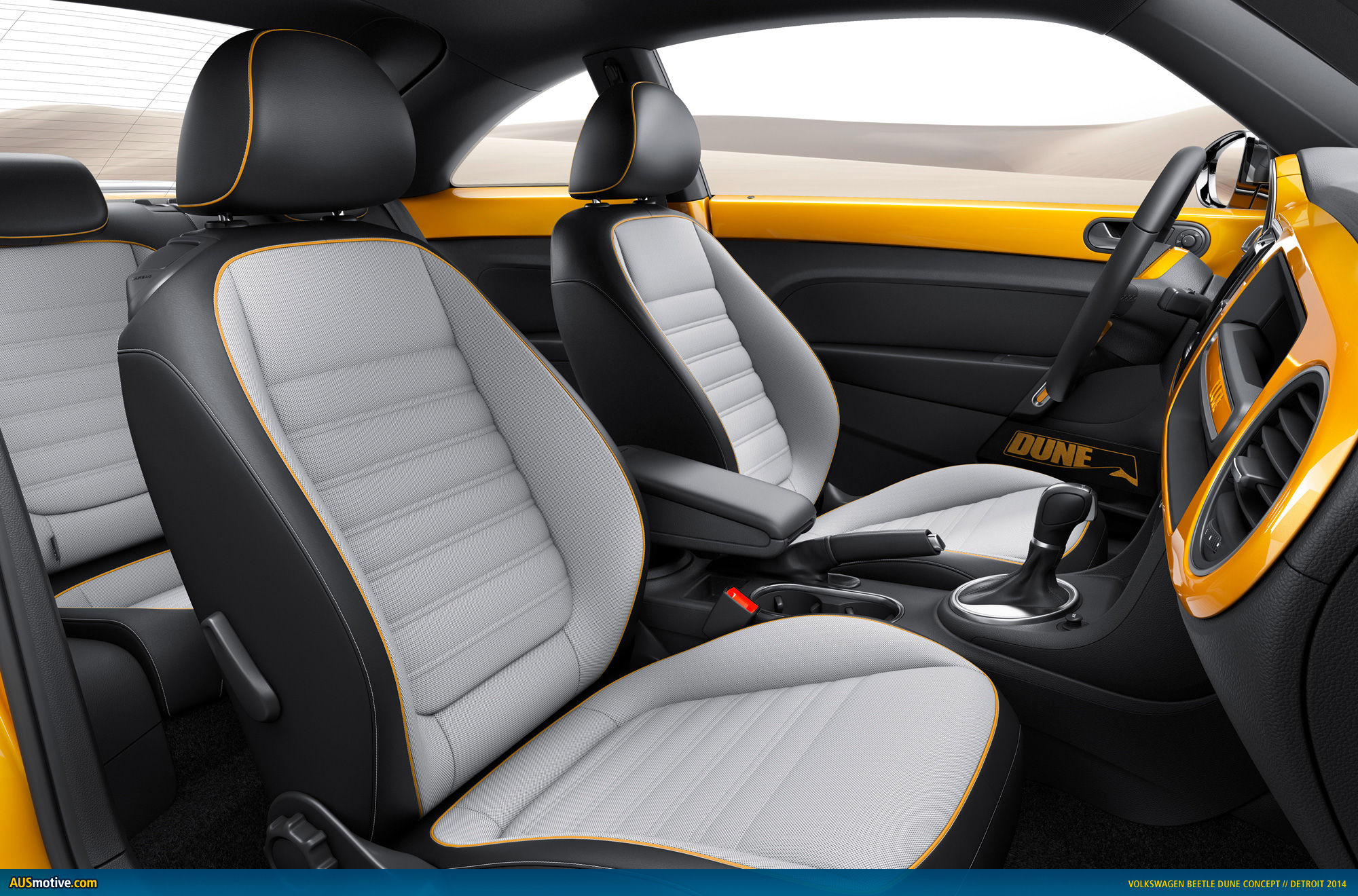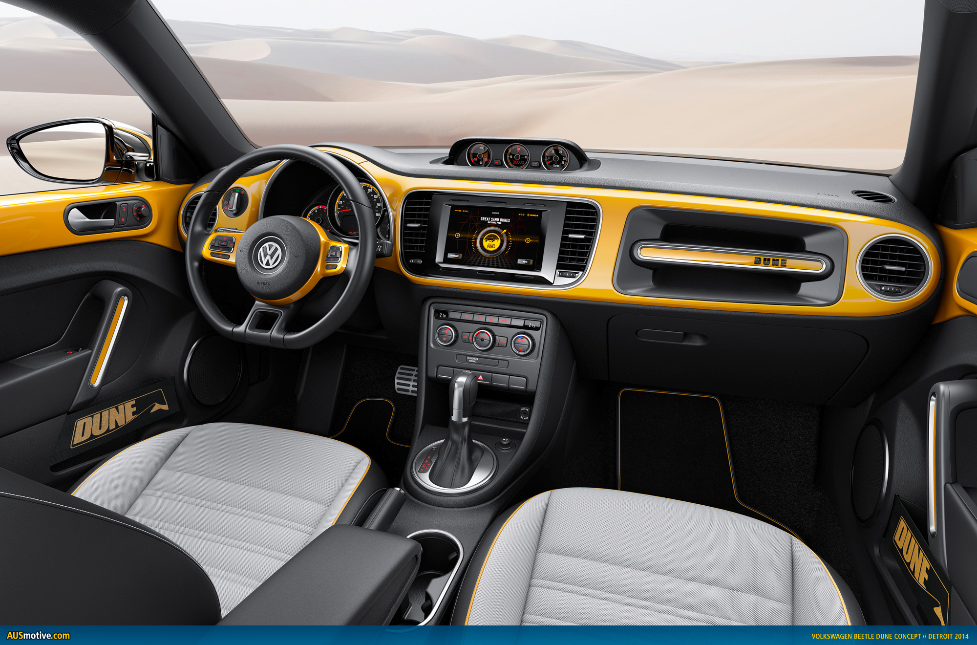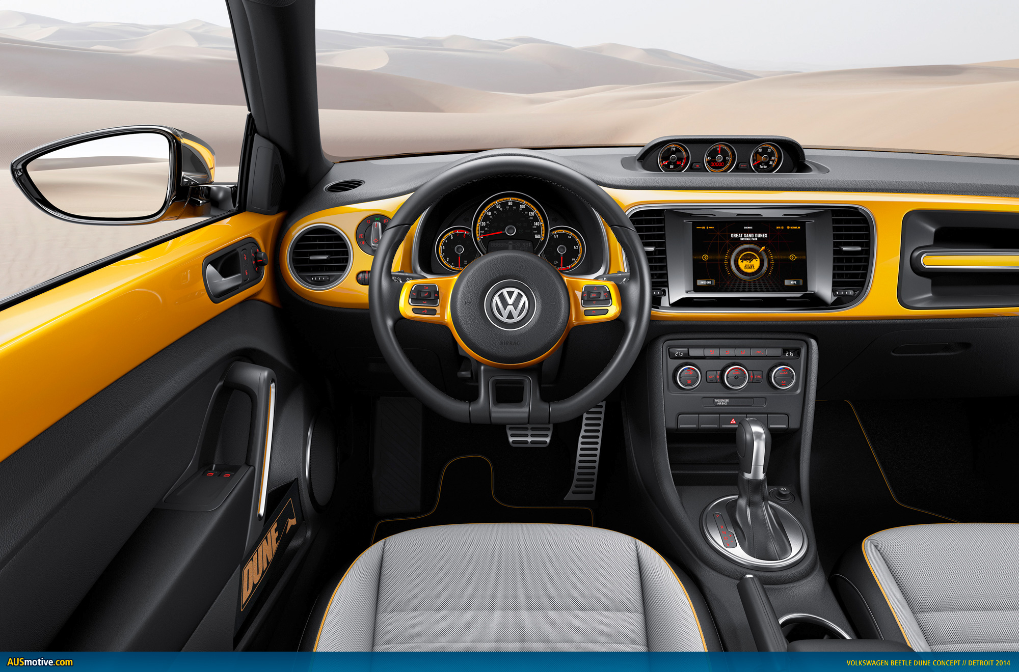 Beetle Dune – interior. The Dune team also customized the entire interior both visually and technically. Two aspects stand out in particular. First, there is the dashpad painted in “Arizona” car color which does not have the legendary Beetle box on the passenger’s side this time – in this car it was replaced by the no less legendary grab handle of the original Beetle which consists of the rubberized material of the interior door handles and an integrated aluminum accent in car color. The Dune signature is embossed in aluminum – a haptic and visual highlight. Second, the entire infotainment system was implemented as a digital interface with a high-resolution 7.7-inch touchscreen. An AMOLED (Active Matrix Organic LED) display is used here which renders extremely fine details. A tribute to the New Beetle Dune of 2000 is the digital display of the car’s pitch and roll, which was integrated in the main instrument back then.