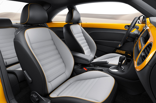 So what do you get that makes it different from your garden variety Beetle? Most obviously there’s a bunch of model-specific cosmetic enhancements, inside and out. But the Dune has been raised by 50mm to give it that crucial urban clearance. And, check this out, it has ski racks on the back window. Yes, ski racks! You know for the snow. Where the roads are slippery and you often need to fit chains, unless you have an all-wheel drive car.