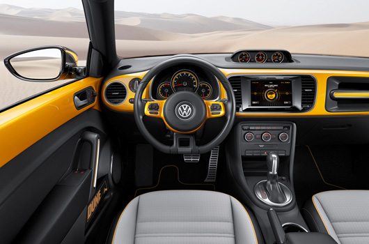 In its engine technology, the Dune crosses over to the production model, as mentioned. And that is good, because this Beetle is more agile than ever before. Consider the engine: the 210 PS turbocharged gasoline engine – combined with a 6-speed DSG transmission – accelerates the Beetle Dune to 60 mph in just 7.3 seconds (100 km/h: 7.5 seconds). If necessary, a top speed of 141 mph or 227 km/h is feasible – in America this would be a speed for the race track, in Germany a speed for open sections of the Autobahn that have no speed limit. More impressive and important, however, is the awesome way in which the Volkswagen transfers its power to the road. Here, the front-wheel drive car exploits the benefits of such features as its high-class suspension layout (precise wheel location by the front MacPherson suspension and innovative four-link rear suspension). In all of the more powerful Beetle cars with turbo gasoline engines – and therefore also in the Dune – the electronic XDS differential lock is standard.
