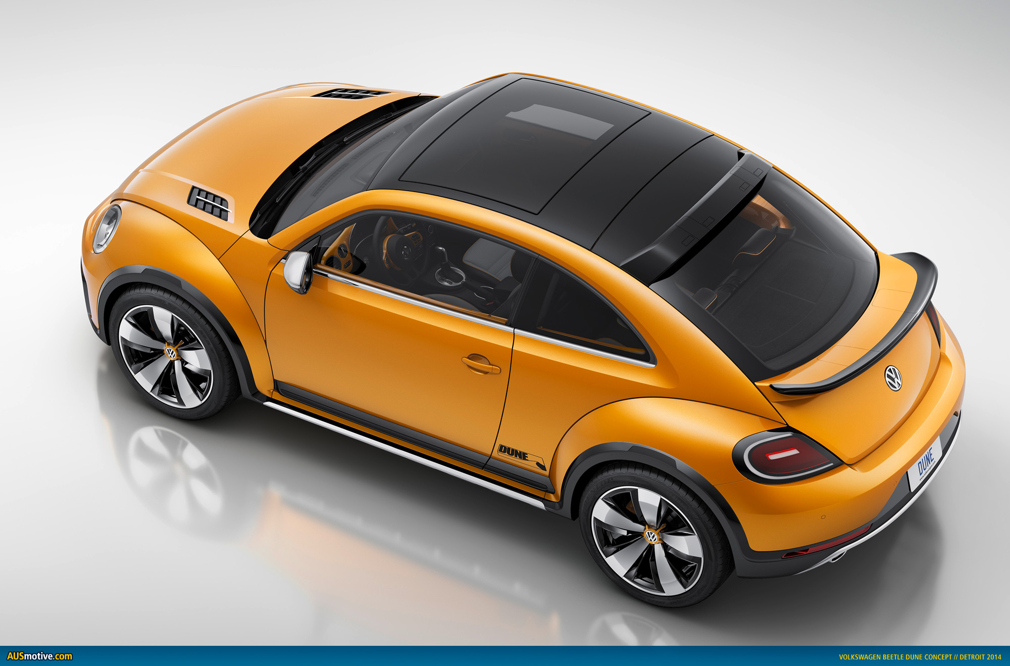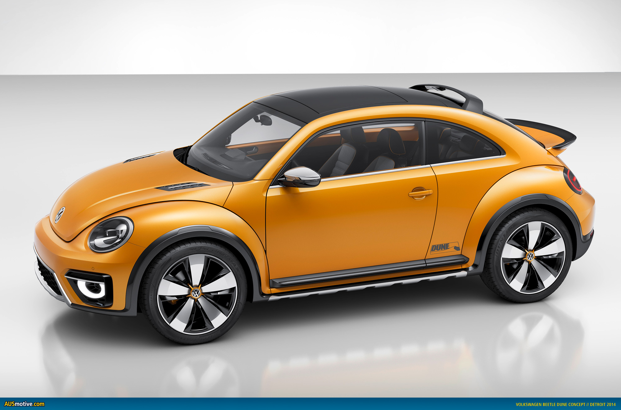 Beetle Dune – side profile. The Dune concept harbors the potential for a new production version of the sportiest Beetle ever. Painted in “Arizona” – a yellow-orange metallic. This warm color itself is sure to elevate the mood. Meanwhile, the two-part wheel well extensions are offset in black. They are rugged elements with a matt finish like those used on Cross models of Volkswagen. The difference here: integrated on top of the main matt parts are what are known as “blades” – elements that are just 1.5 mm thick, as thin as a razor. They appear to hover above the rather massive wheel housings, because the shiny and matt parts do not contact one another directly. The wheel housings – each with a semi-hexagonal cut-out – widen the body by a considerable 24 mm on each side for a total width of 1,856 mm (gain of 48 mm). The Beetle Dune is 4,290 mm long (gain of 12 mm) and 1,536 mm tall (gain of 50 mm).