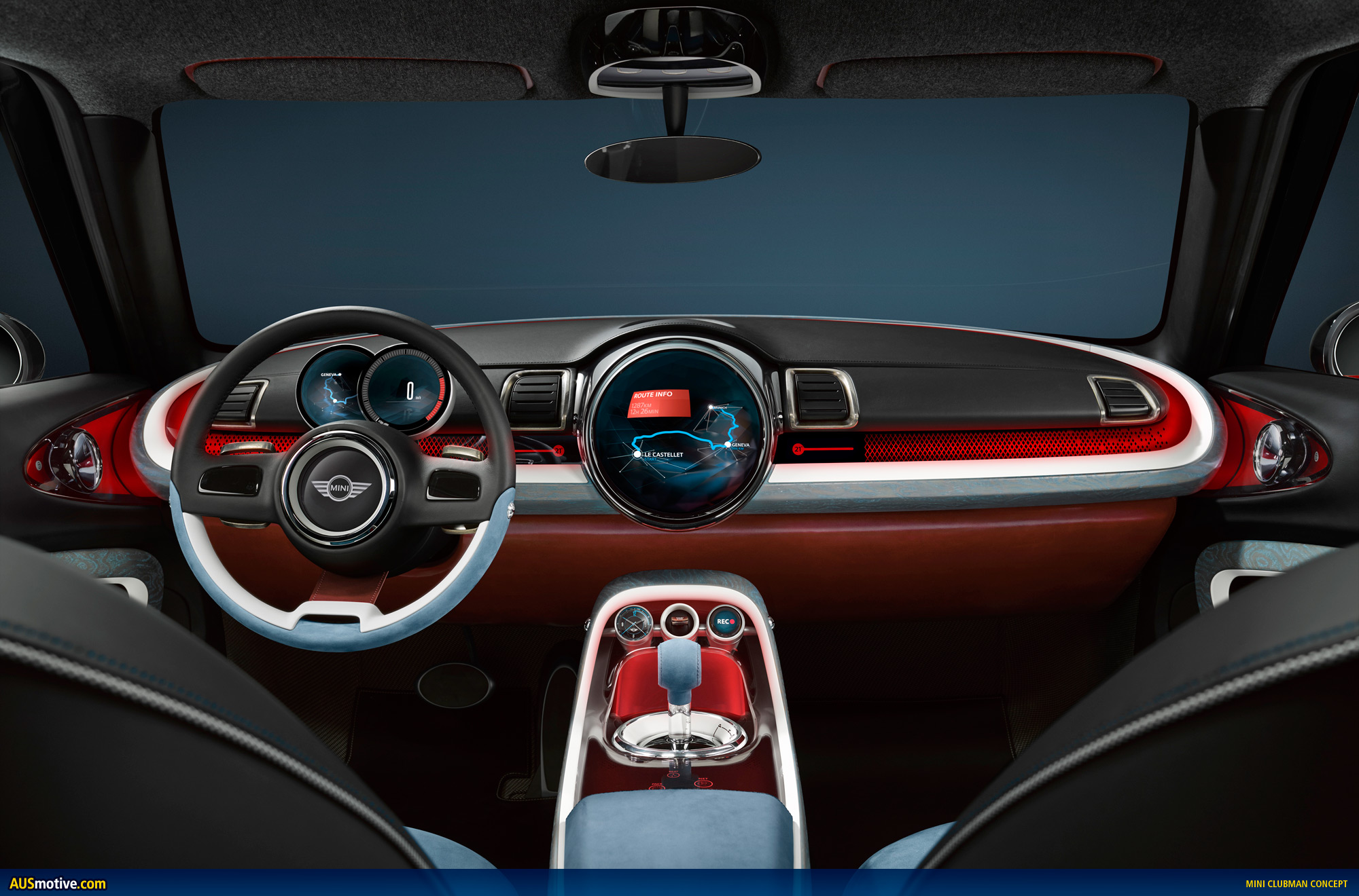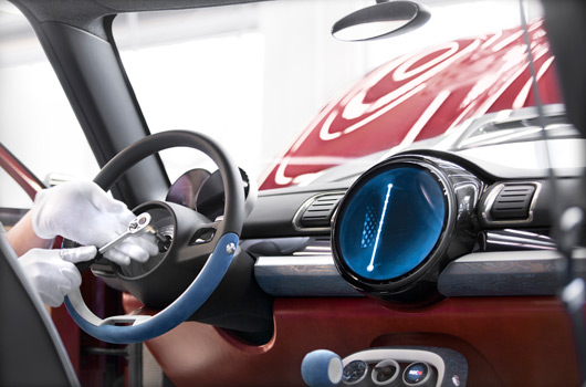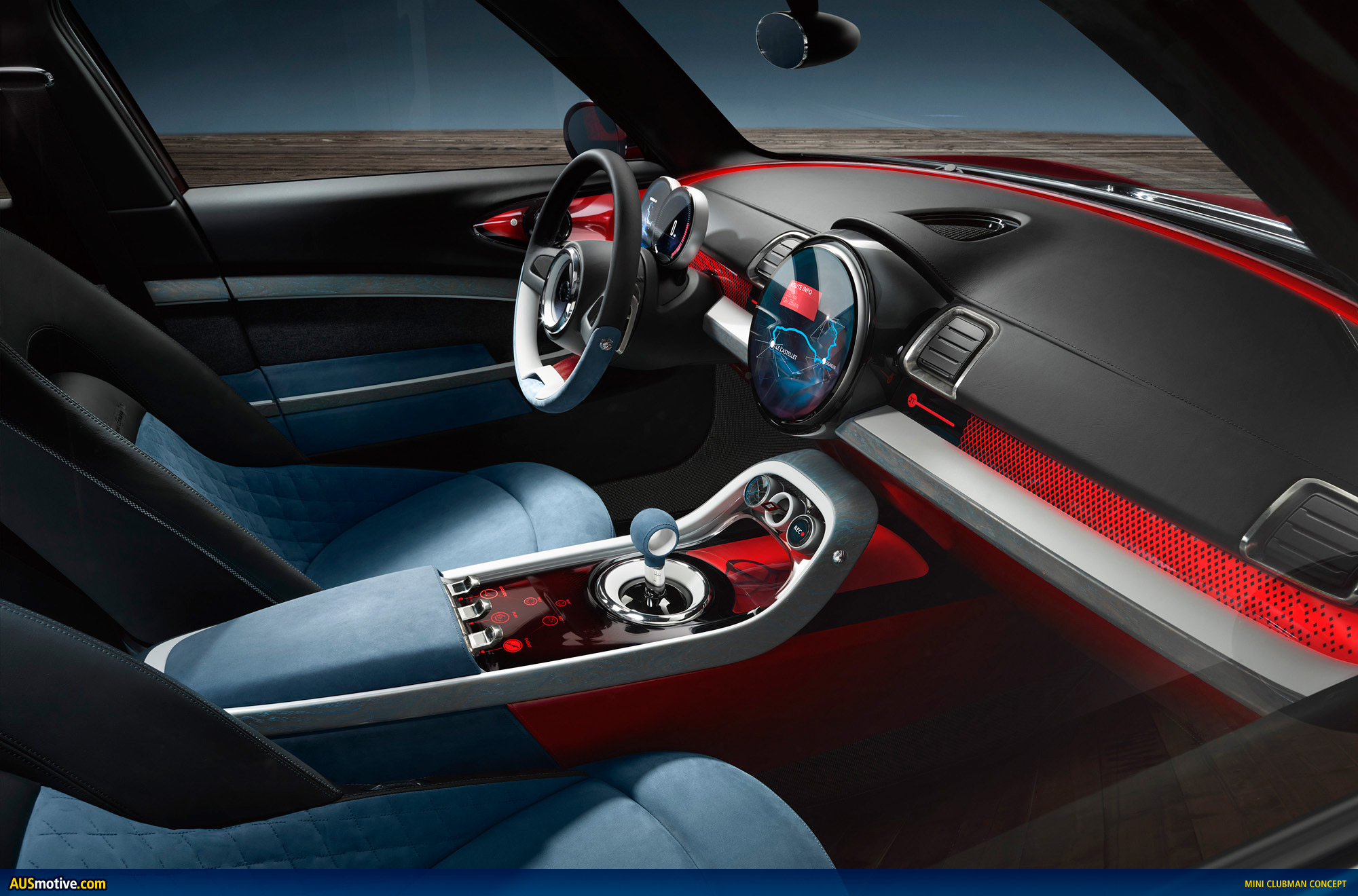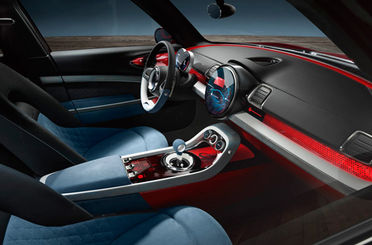 The unusual materials are especially worthy of mention: nubuck leather in a light Sky Blue, patent leather in rich Berry Red and black soft nappa leather ensure an exclusive interior atmosphere which is highly expressive. In between, elements in patinised silver add high-end accentuations. The patina gives them the character of familiar, fondly used items. Decorative strips in blue limed ash grain convey cool, modern elegance. The two highly expressive fabrics Tweed Grey and Black Twill set an attractive counterpoint to the classic value attributes of wood, leather, silver, thereby creating the familiar MINI interior experience. Small details such as the buttons with Union Jack embossment on the seats and central console, contrast stitching, piping or red accentuation surfaces in the sunblinds which only appear when these are folded down all add a touch of surprise to the mature character of the MINI Clubman Concept.