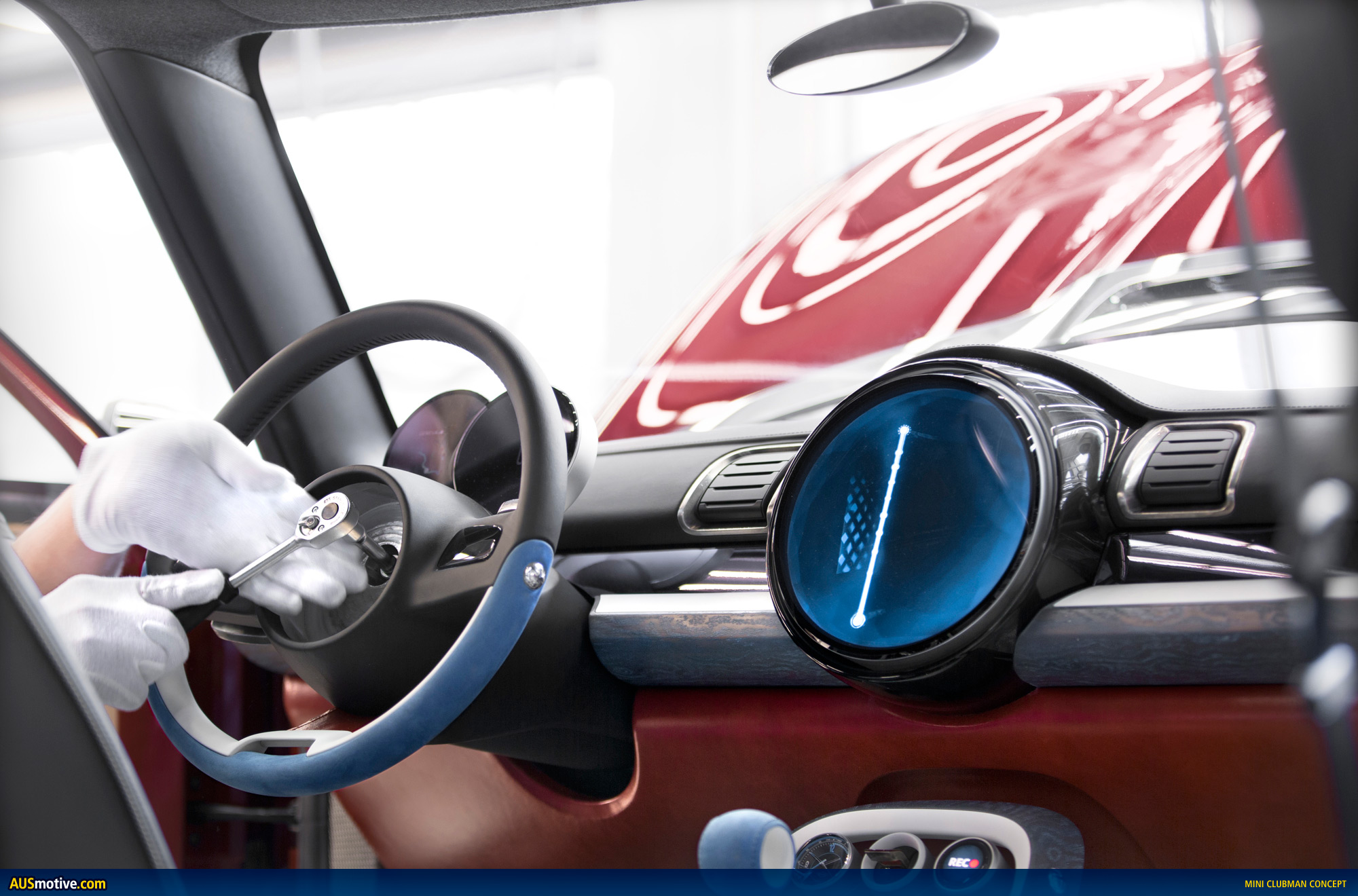 The interior element of the MINI Clubman Concept with the most powerful presence is the leather-covered instrument panel. With a surround in blue limed ash grain and a white porcelain finish, the black upper section of the instrument panel has a hovering appearance. Indirect rear lighting of the gap reinforces this impression and gives the area in front of the driver and front passenger an extremely high-end ambience. The linear air vents have patinised, silver-plated surrounds. Between the air vents there is an area in Black Chrome which can be back-lit if required that provides additional information for the driver and front passenger. The suggested “Faded Diamonds” rhombus pattern gives the Black Chrome surface a particularly high-quality structure. The lower section of the instrument panel is finished in Berry Red patent leather, providing an extrovert yet sophisticated contrast to the more discreet design of the upper half.