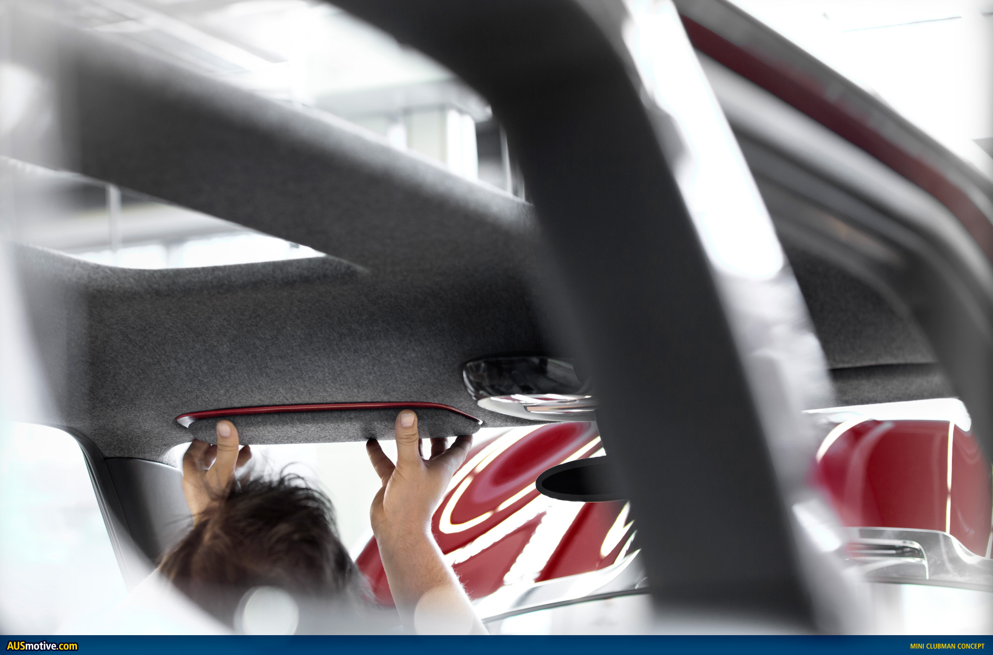 Even with larger exterior dimensions, the MINI Clubman Concept is instantly recognisable as a typical MINI. With the characteristic agility of the MINI proportions, the prolonged roof line clearly reflects the car’s extensive utility space. It also gives the silhouette a distinctive elegance, underscored by generous surfaces. The powerful, warm Berry Red colour shows surfaces and shapes to optimum effect. The roof in the colour “Blade” – a metallic grey – creates an elegant contrast with the warm red of the corpus.