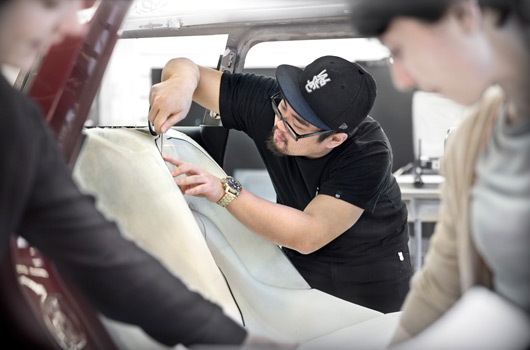 The newly interpreted ellipse in the side runs dynamically across the two doors to create a visual link between front and rear. The armrests in blue nubuck leather appear to hover in the doors, while behind them there are practical storage compartments. The decorative surfaces in the doors have indirect backlighting to underscore the inviting, contemporary ambience. The side mirrors and roof liner recede discreetly into the background due to use of high-quality fabric Tweed Grey in salt-and-pepper look, while the quality weave of the fabric Black Twill with classic black-and-white contrast on the floor and mats makes for an elegant finish.