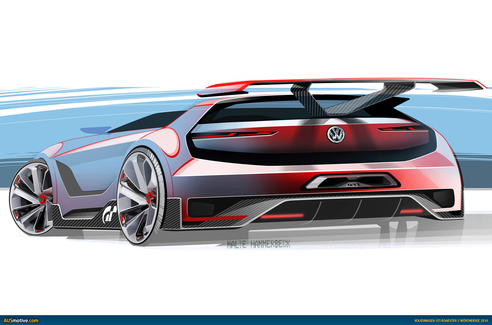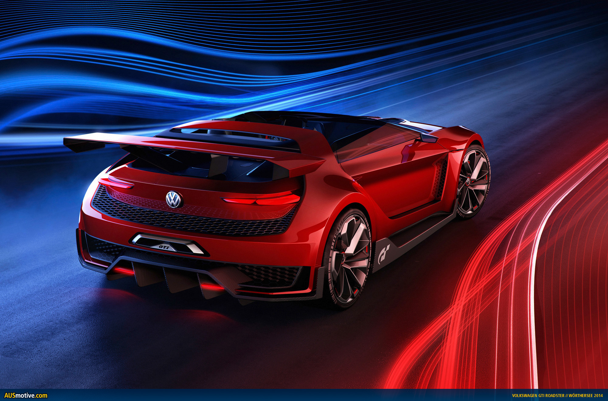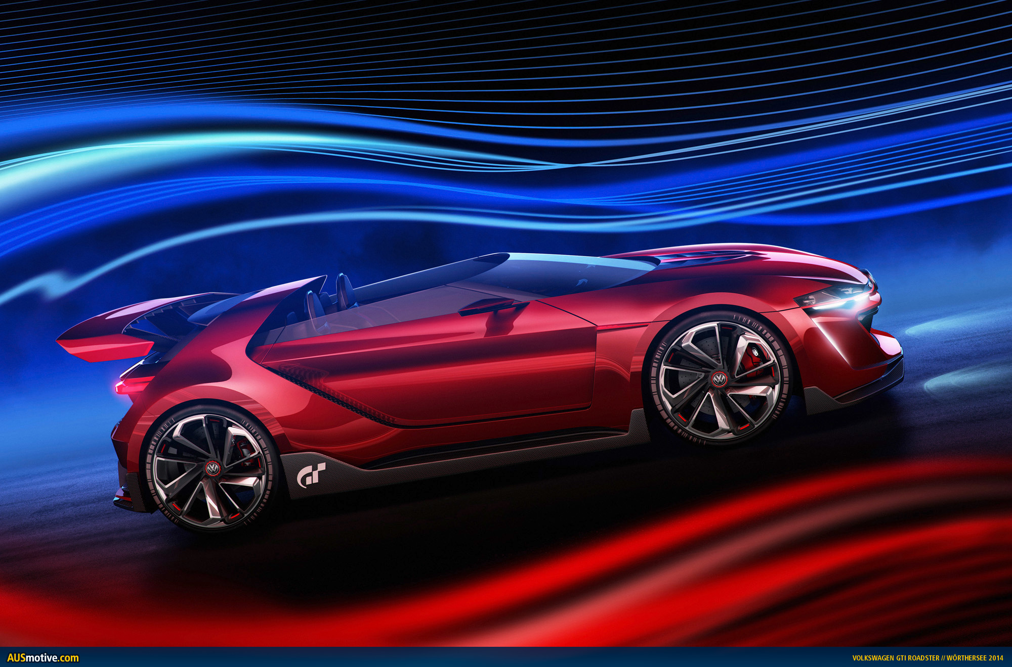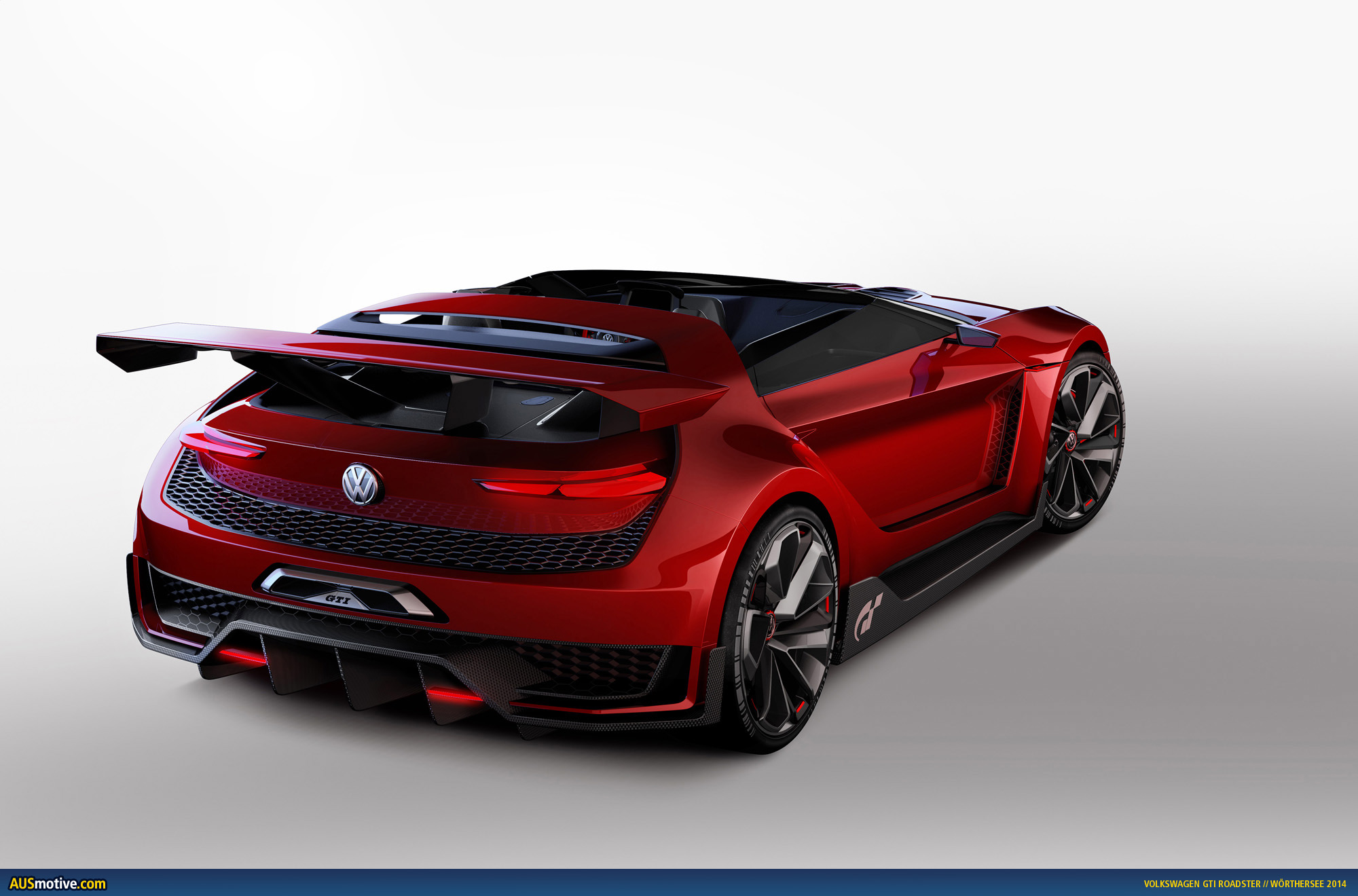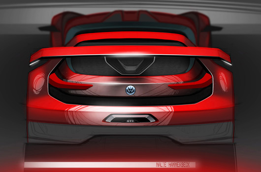 GTI W12-650, Design Vision GTI, GTI Roadster. In designing the “GTI Roadster, Vision Gran Turismo”, Volkswagen revolutionized the visual concept of the “Design Vision GTI” concept car that was presented at Wörthersee in 2013. It was further developed, reinvented and sent into the future as a roadster. The specifics: the roadster was completely redeveloped, however the “Design Vision GTI” of 2013 still paved the way, because Volkswagen used it to show how a GTI for motorsport might appear – for the first time since the “Golf GTI W12-650” was presented in Wörthersee in 2007. Important to know: design highlights of the 2013 concept car are the C pillars and side sills that flare out from the body on a second level. Designers exteriorised them as independent body elements to create space for the car’s much larger track widths and specially developed 20-inch wheels. Despite its extreme modifications, the “Design Vision GTI”, with a top speed of 300 km/h, had a very homogeneous appearance – as though it might start in a car race tomorrow. The reason is that designers based their work precisely on the fundamentals of Volkswagen Design-DNA – despite all conceivable freedoms of design. The same applies to the new “GTI Roadster, Vision Gran Turismo”. A superlative two-seat convertible GTI which – and this is crucial – takes up the idea of the C pillars and side sills (carbon on the Roadster) and expresses it on another level.