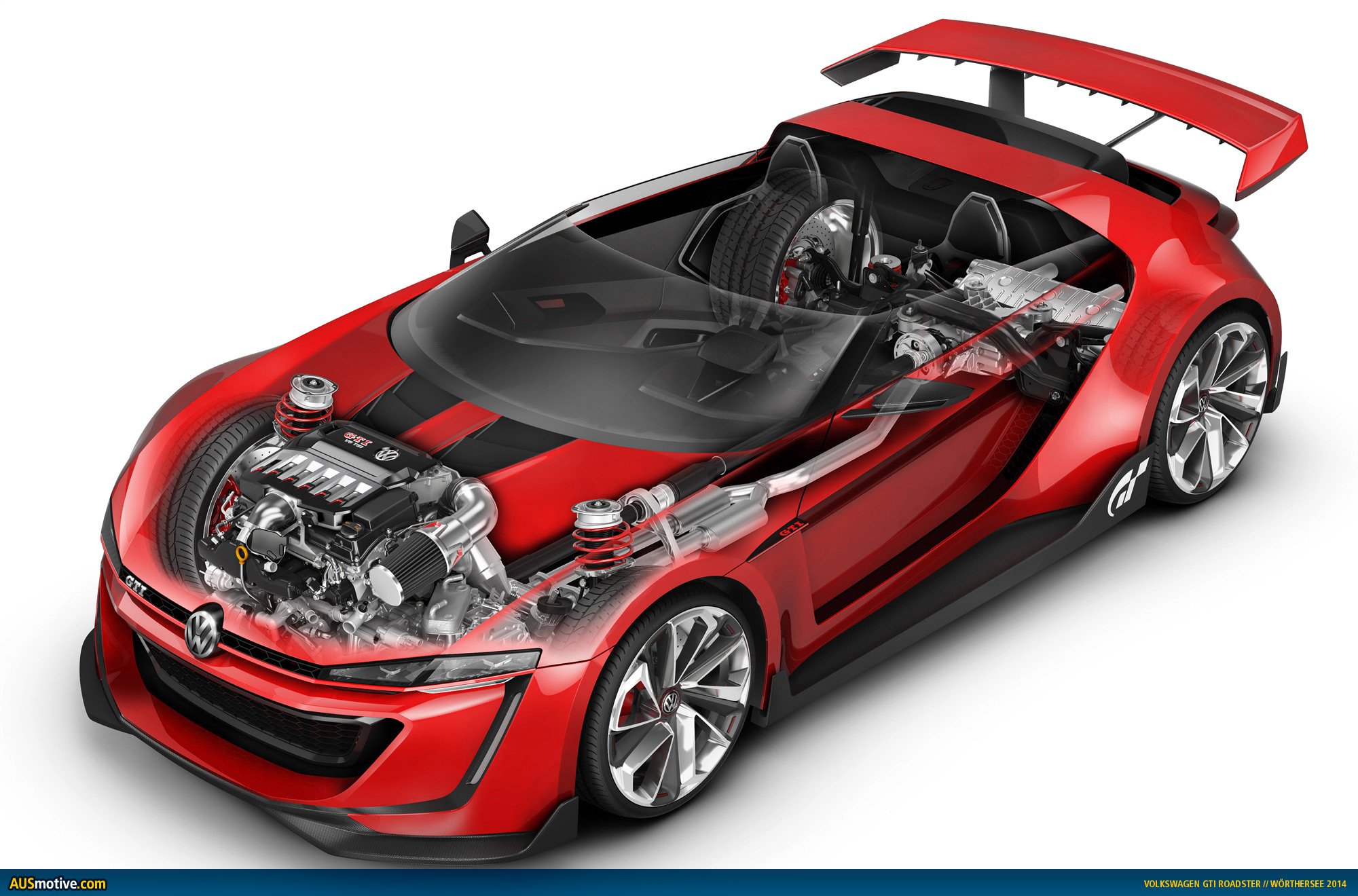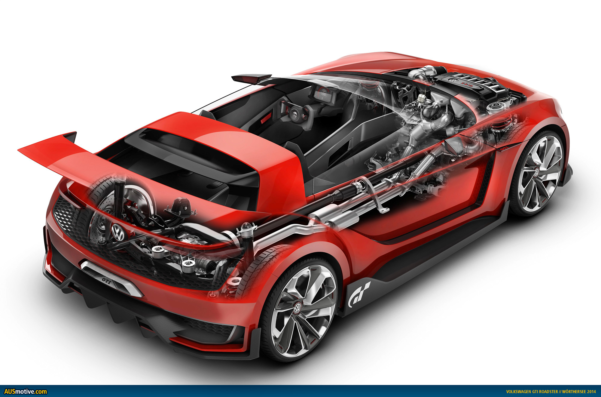 At the legendary GTI meet at Wörthersee (28 to 31 May), Volkswagen is erasing the boundaries between the virtual and real worlds. That is because, in a world premiere, the inventor of the Golf GTI is presenting a show car which was originally created as a purely computer generated car in bits and bytes for the PlayStation®3 classic “Gran Turismo 6” (“GT6” developed by Polyphony Digital Inc.): the “GTI Roadster, Vision Gran Turismo”. The two-seat convertible is powered by a 3.0-litre V6 biturbo engine that produces a power of 370 kW / 503 PS. The V6 TSI develops a maximum torque of 560 Nm between 4,000 and 6,000 rpm; 500 Nm of that torque is already available at 2,000 rpm in the direct-injection petrol engine. The enormous power of the TSI is transferred to the 20-inch wheel-tyre combination via a 7-speed dual-clutch gearbox (DSG) and all-wheel drive system (4MOTION). The lightweight 1420 kg super sports car reaches 100 km/h in 3.6 seconds. V/max: 309 km/h!