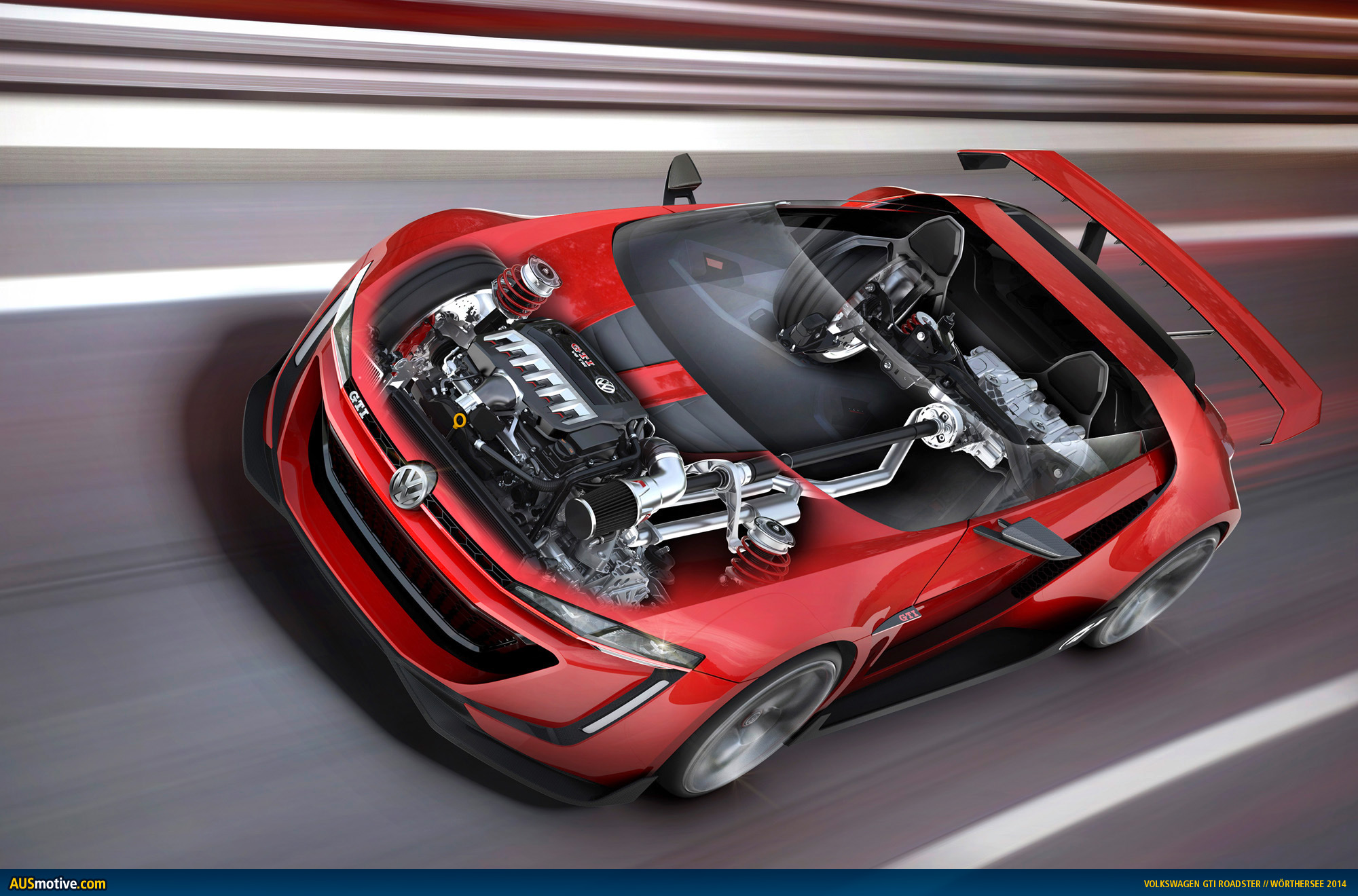 That power is sent through a 7-speed DSG and 4motion all-wheel drive system and Volkswagen says its 1420kg concept can reach 100km/h in 3.6 seconds. Keep your foot planted and you’ll top out at 309km/h.