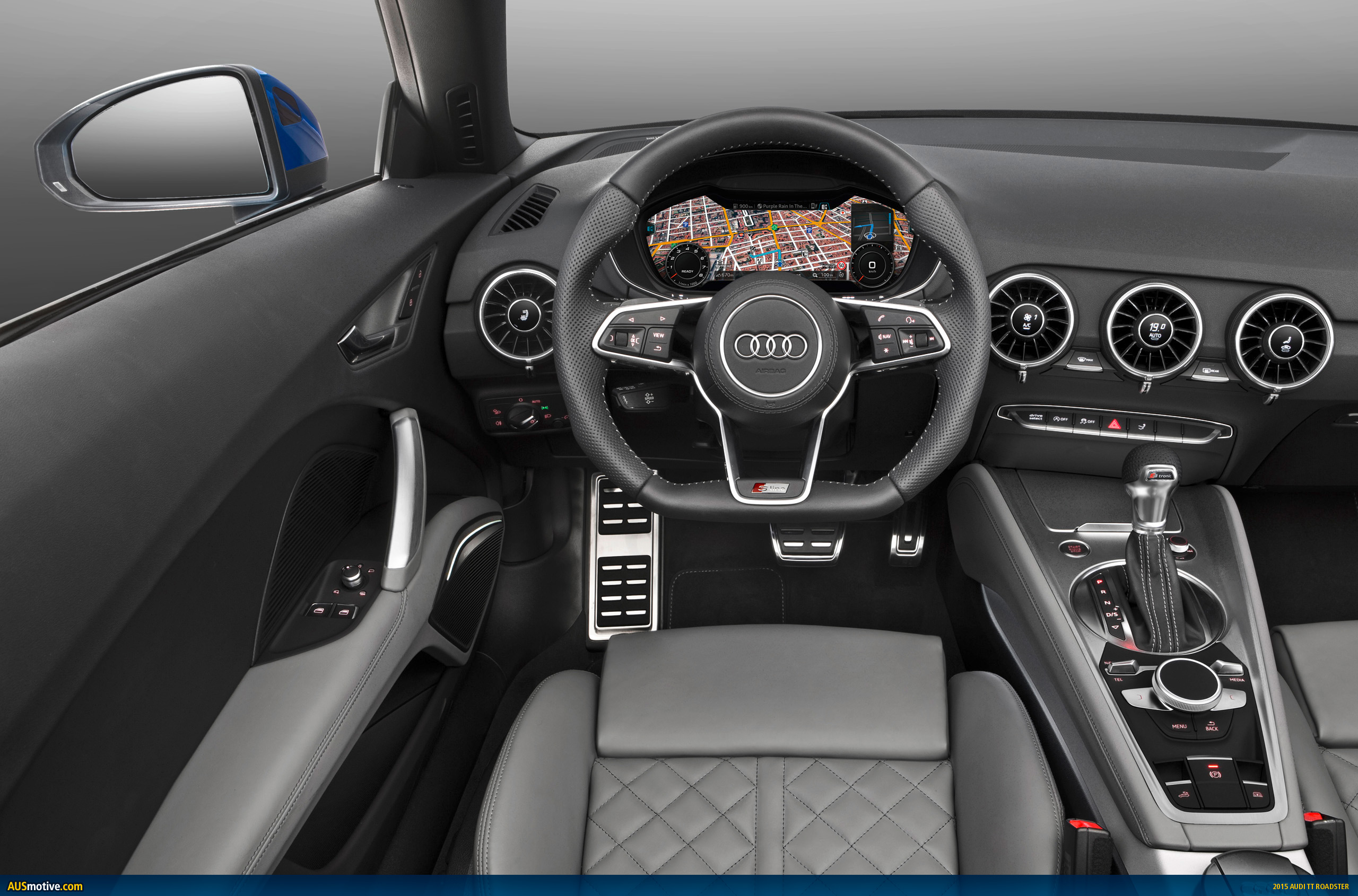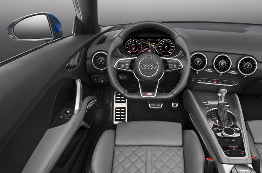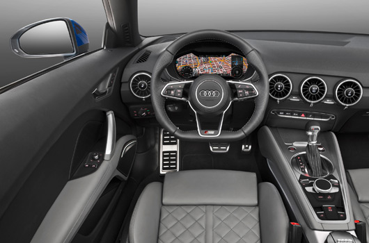 Another top innovation in the new TT generation is the Audi virtual cockpit. With its versatile, detailed depictions, the digital instrument cluster replaces the analog instruments and the MMI monitor. It is possible to toggle between two levels of the 12.3‑inch display. The classic view is dominated by the tachograph and the rev counter, whereas “infotainment†mode focuses on themes such as the navigation map. The TTS Roadster features a third, particularly sporty view that focuses on the rev counter as an important racing instrument.