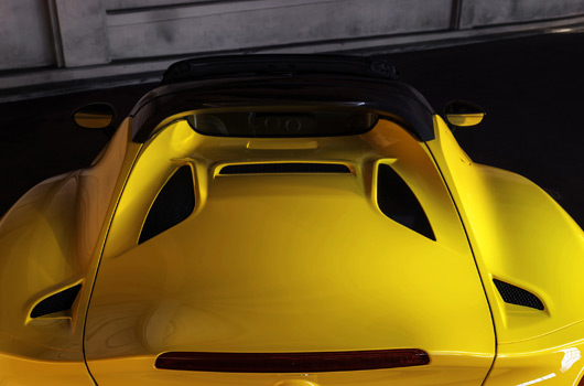 Thanks to the monocoque’s inherent rigidity, Alfa Romeo engineers were able to minimize structural differences between the 4C Spider and 4C Coupe. For a technical look, header strength and to keep the center of gravity low, the 4C Spider features a unilateral carbon fiber windshield frame that is adhered and bolted to the monocoque chassis. In addition, a specially contoured aluminum rollbar (underneath the black or carbon fiber “haloâ€) provides mounting points for the new rear decklid, while unique upper body brackets and a high-strength steel engine compartment cross beam maximize torsional rigidity.