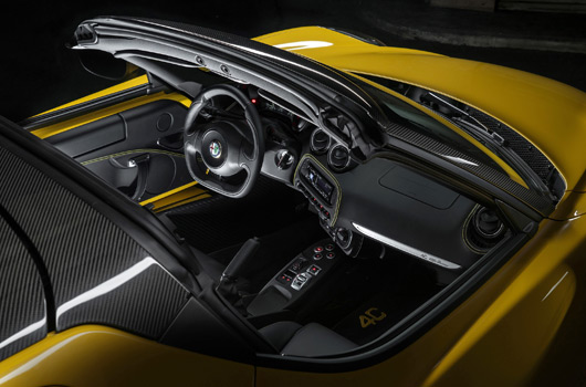 Of course, you’re going to want your 4C Spider with the special Track Package, which means you’ll get special forged aluminium wheels (18×7″ front, 19×8.5″ rear), uprated suspension, grippy Pirelli P Zero tyres, a flat bottomed steering wheel and a few carbon fibre highlights around the cabin.