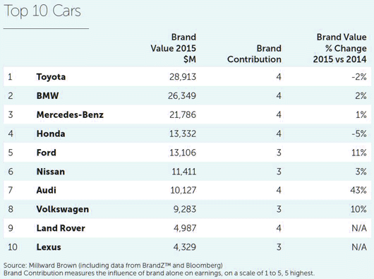 Rounding out the list of top 10 automotive brands are Audi, Volkswagen, Land Rover and Lexus (see more detail in table below).