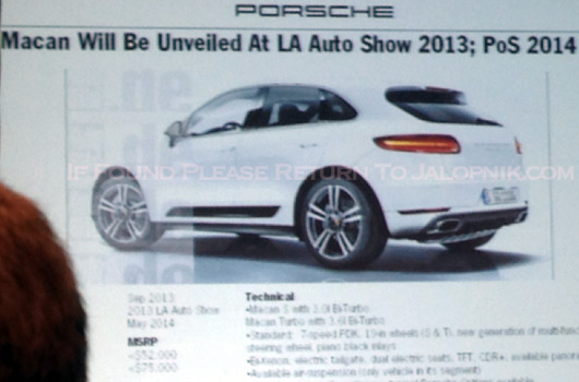 Jalopnik brings word of a series of leaked slides, allegedly from a Porsche dealer function in Atlanta, Georgia. First up is info on the Macan SUV.