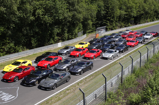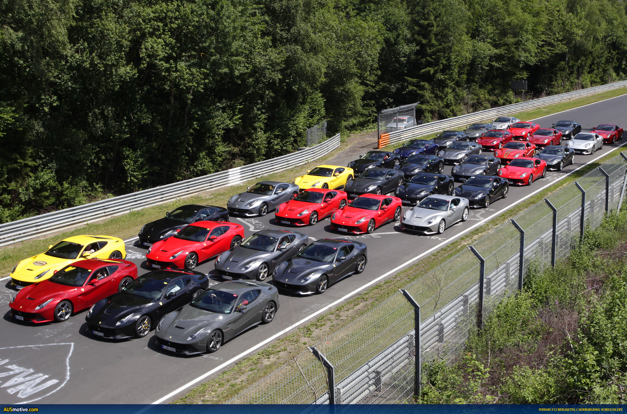 Ferrari assembled 40 owners of the immensely desirable F12 berlinetta and took them to the Nürburgring Nordschleife for a private track day. It was the largest gathering of F12s in Germany.