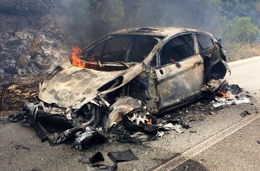 “After we set off again, the car caught fire. We smelt the smoke and as I looked back the rear-right corner was covered in flames. We stopped straight away but they were already over the roof. I managed to empty three fire extinguishers but it didn’t do anything to calm the blaze. There was nothing we could do to save the car.”