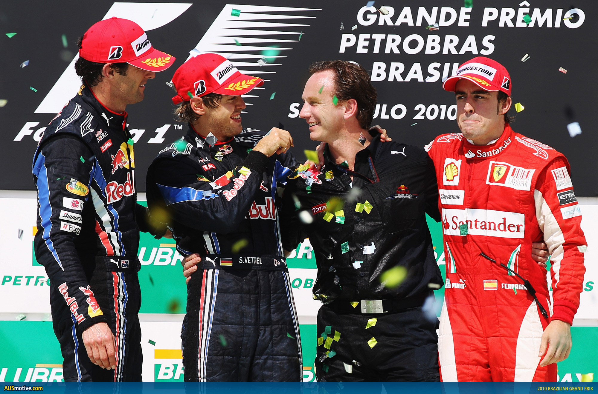 So it was another Red Bull Racing one-two in Brazil this morning, with the young German Sebastian Vettel taking the win to keep his title hopes well and truly alive. Australia’s Mark Webber came home second and is still the closest man to Ferrari’s Fernando, some eight points behind. Alonso, third, simply needs to finish second or better at next weekend’s Abu Dhabi Grand Prix to become the youngest man to be crowned a triple World Champion.
