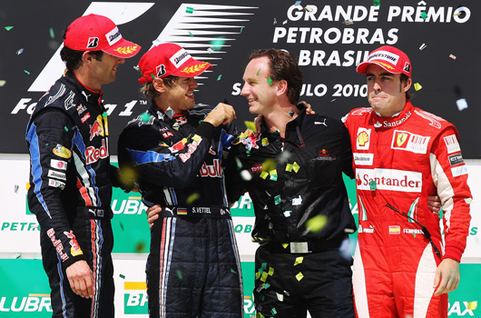 The Constructors’ Championship was decided in Sao Paulo with the maximum points haul for Red Bull enough for the Milton Keynes based outfit to deny the chances of McLaren. Cast your mind back to the bits and pieces that were left over from the old Jaguar team at the end of 2004 and consider their reincarnation as Red Bull Racing is now the best team in F1; very impressive given the resources and history of their closest opponents. As Team Principal it is fair and reasonable that Christian Horner was on the podium to claim the team’s trophy, perhaps, though, it should have been Adrian Newey; without him the RB6 may not have been the dominant car in season 2010.